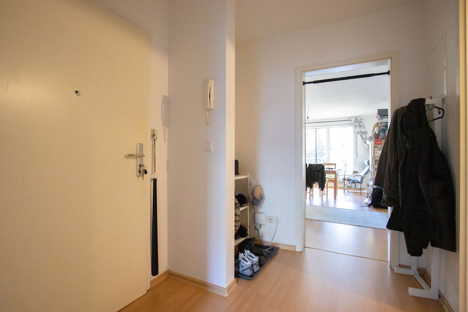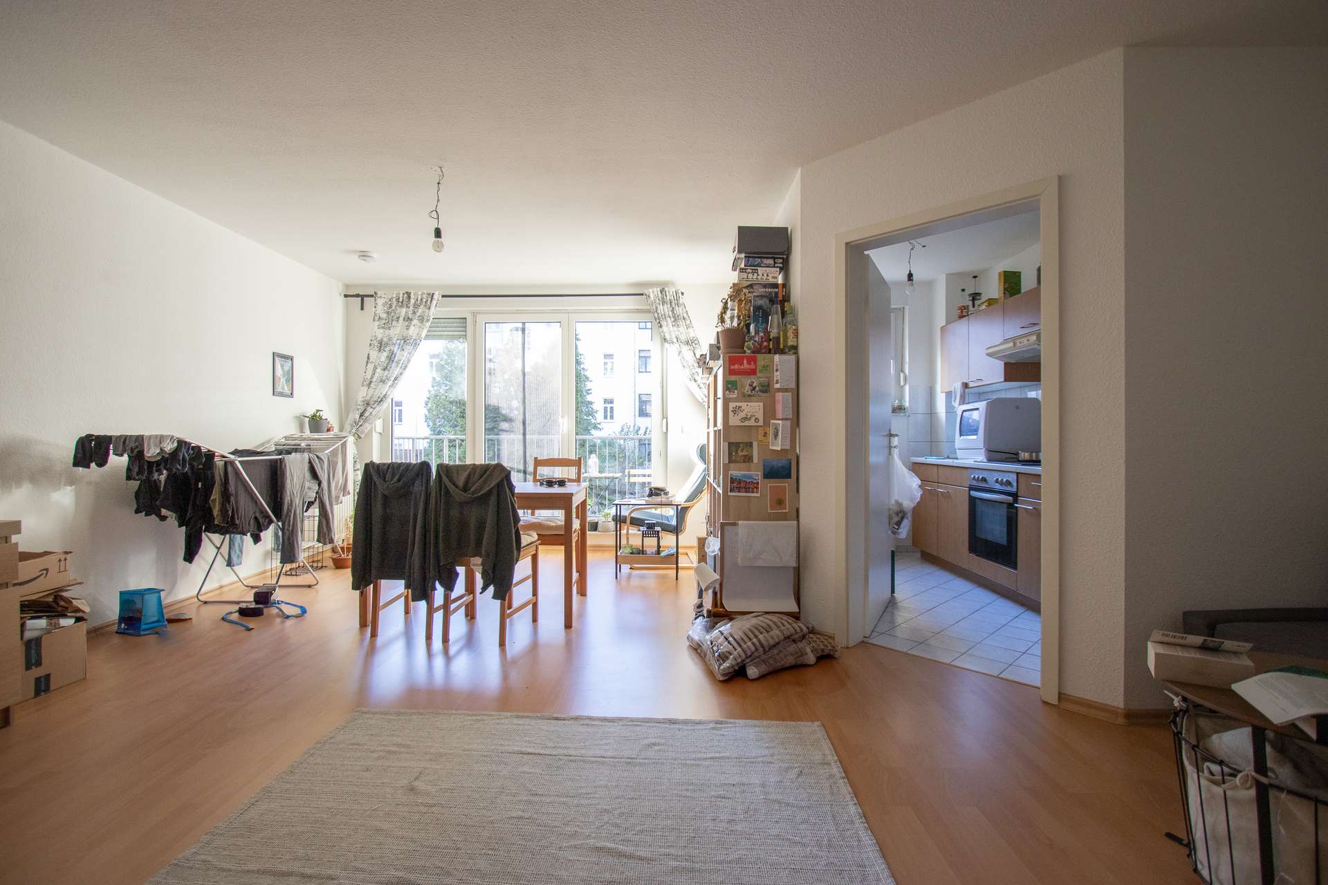 Der Flur verfügt über eine praktische Nische für die Garderobe oder ein Schuhregal. Von hier gelangt man in das Wohnzimmer, welches mit einer angenehmen Größe überzeugt, sodass hier sowohl ein Sitzbereich als auch ein Essbereich eingerichtet werden kann. Am Wohnzimmer befindet sich zudem ein sonniger Balkon mit Südausrichtung, der zum Verweilen an der frischen Luft einlädt.