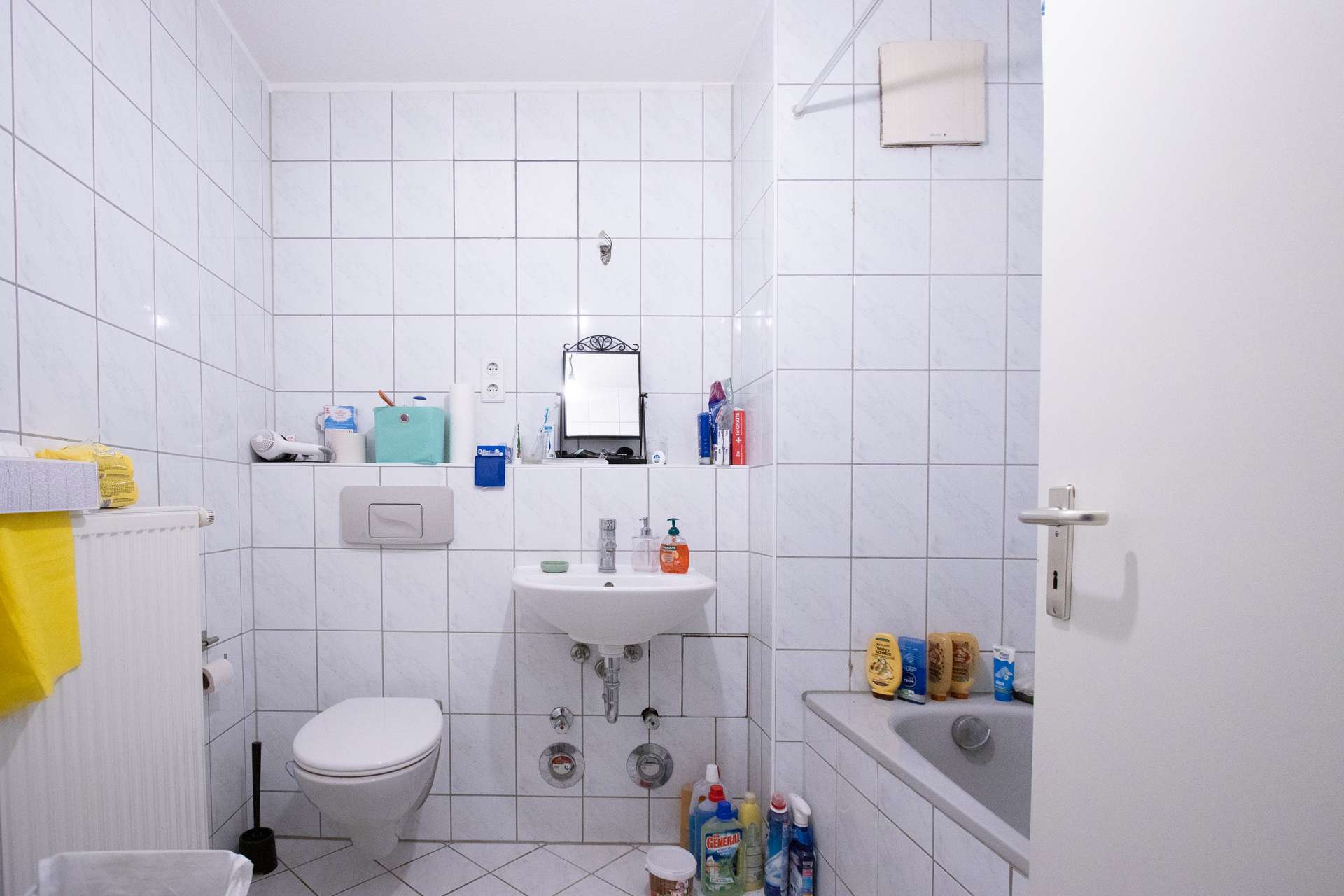 Das raumhoch geflieste Badezimmer verfügt über eine Badewanne. Die Waschmaschine findet ihren Platz im Waschraum im Kellergeschoss. Das zweckmäßig geschnittene Schlafzimmer bietet ausreichend Platz für ein Bett und einen großen Kleiderschrank. Außenrollläden sorgen für optimale Verdunkelung.