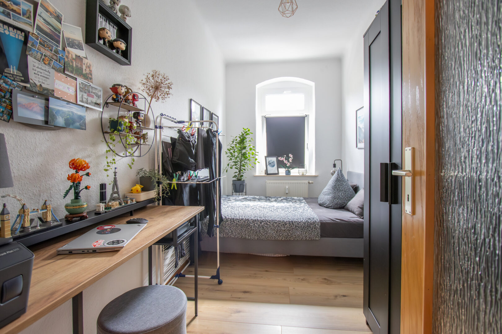 Das Schlafzimmer überzeugt mit ausreichend Platz für ein großes Bett und den dazugehörigen Kleiderschrank. Das daneben befindliche Kinderzimmer bietet ebenfalls genügend Möglichkeiten zur Möblierung mit Bett, Kleiderschrank und Schreibtisch.