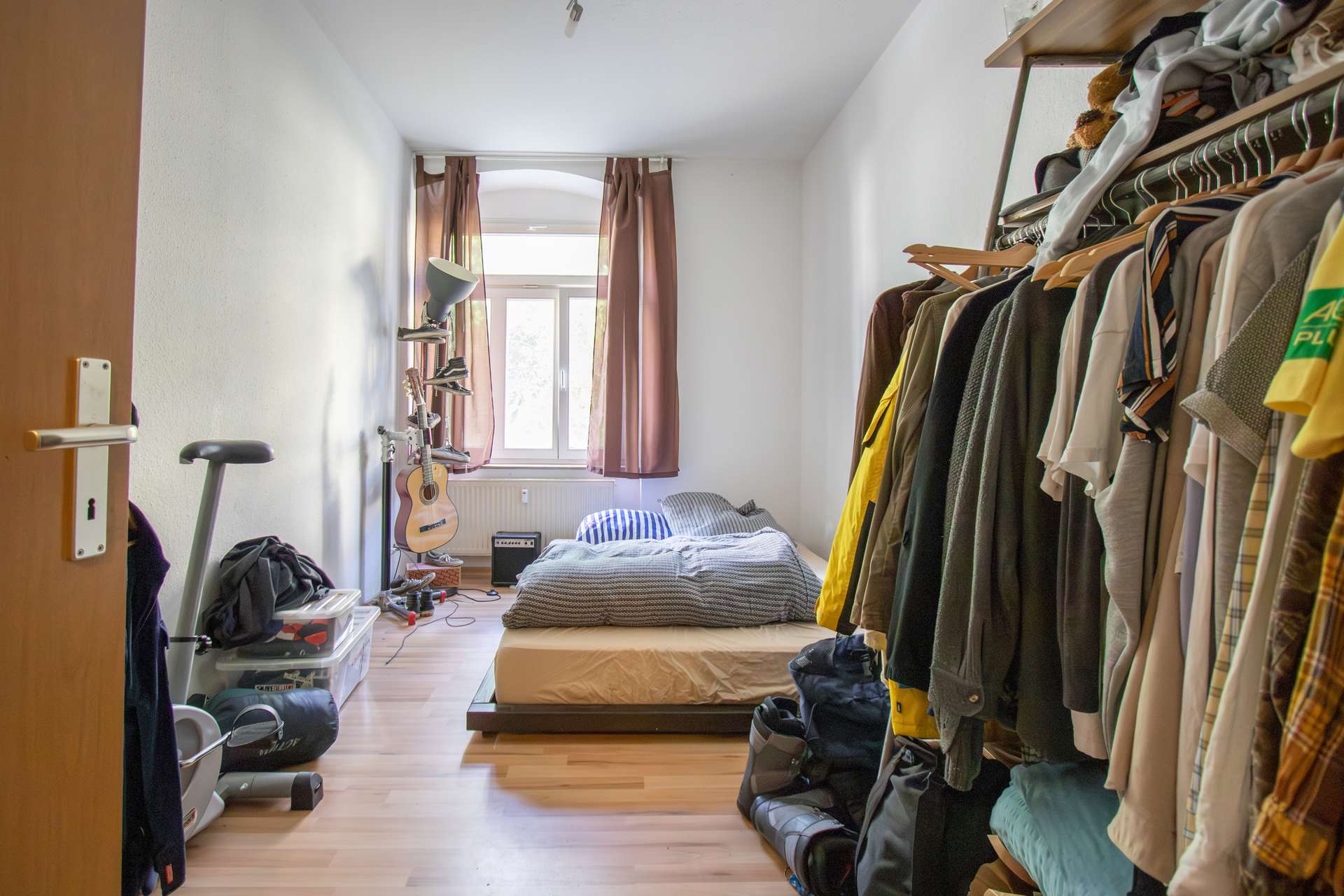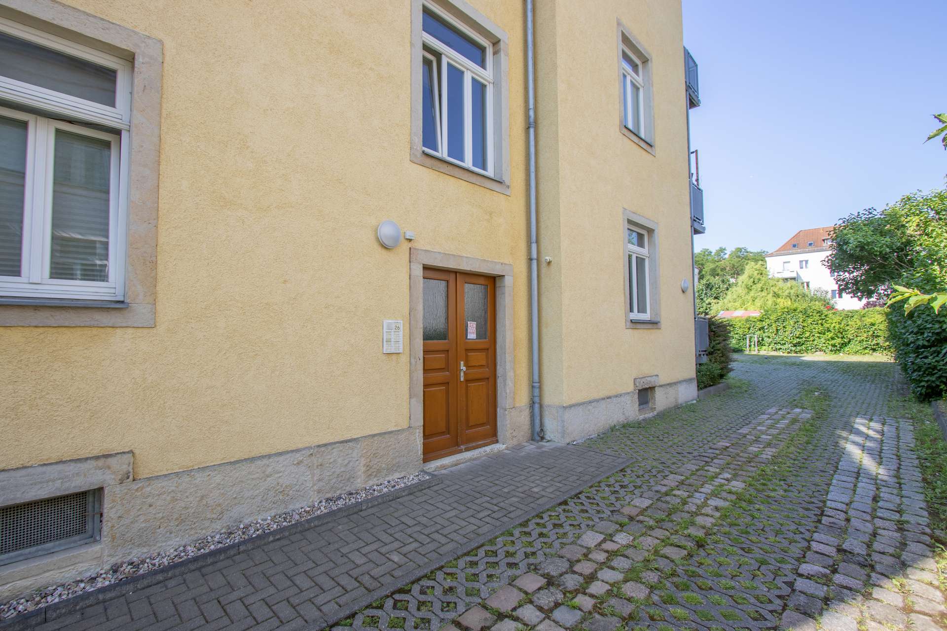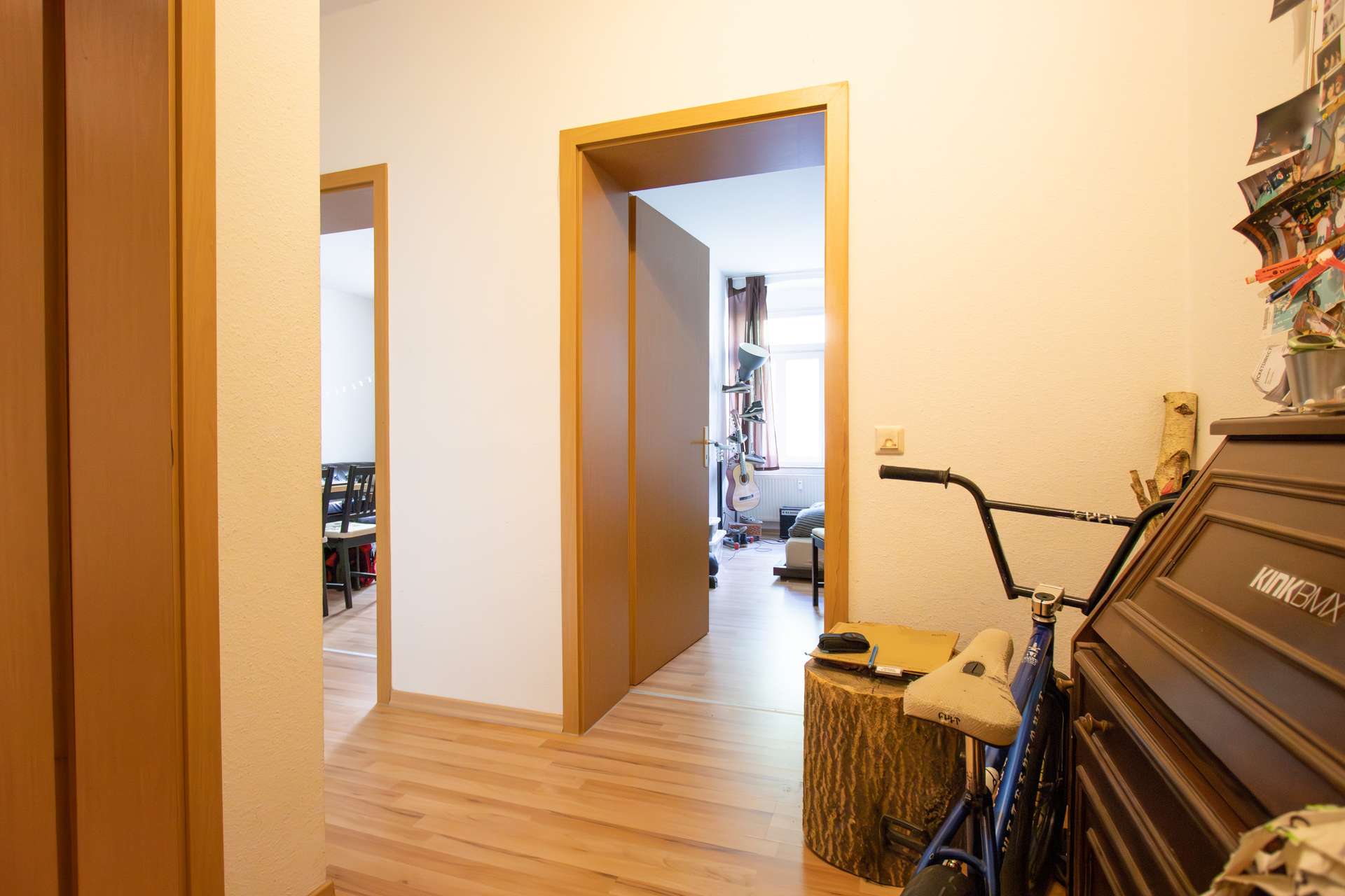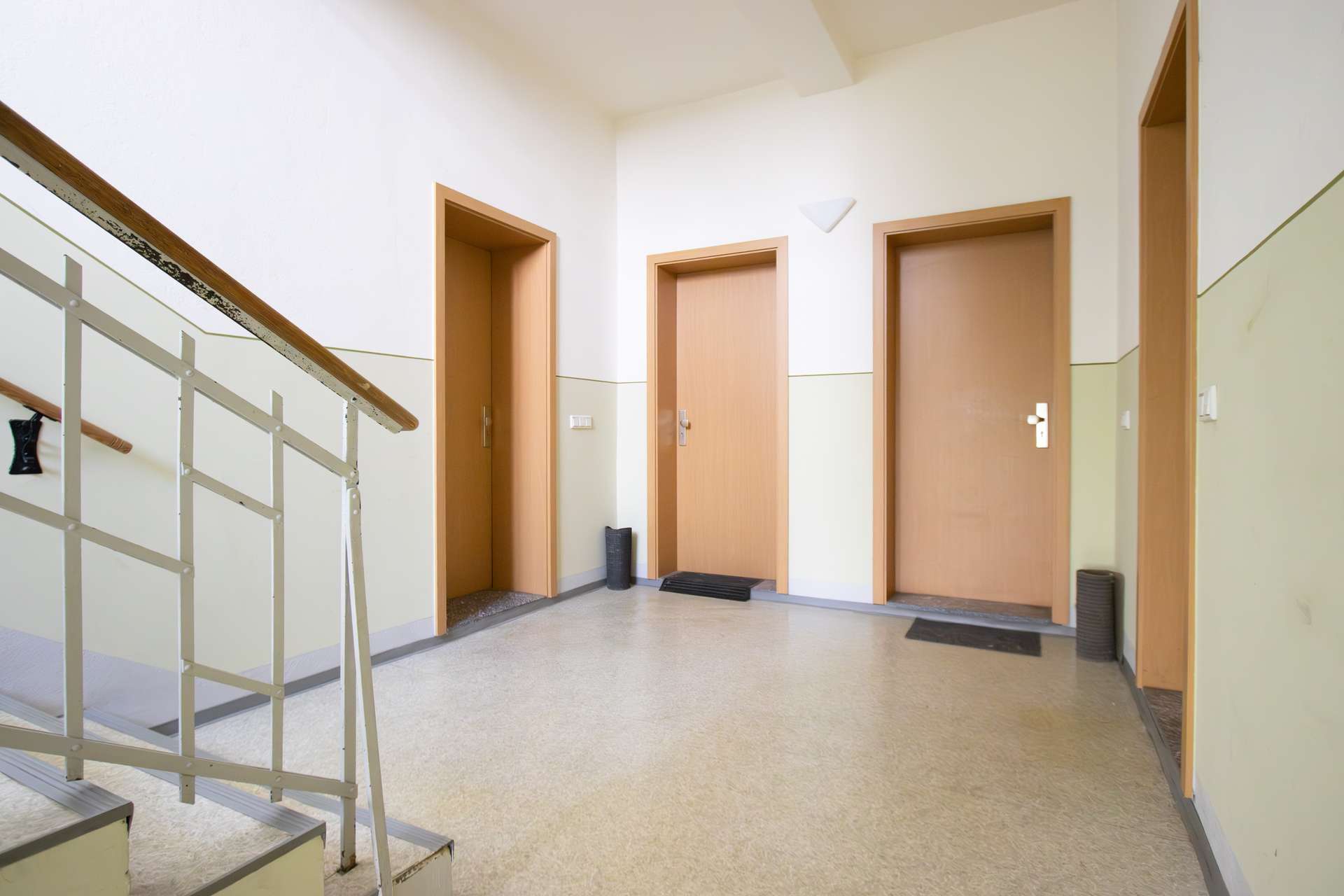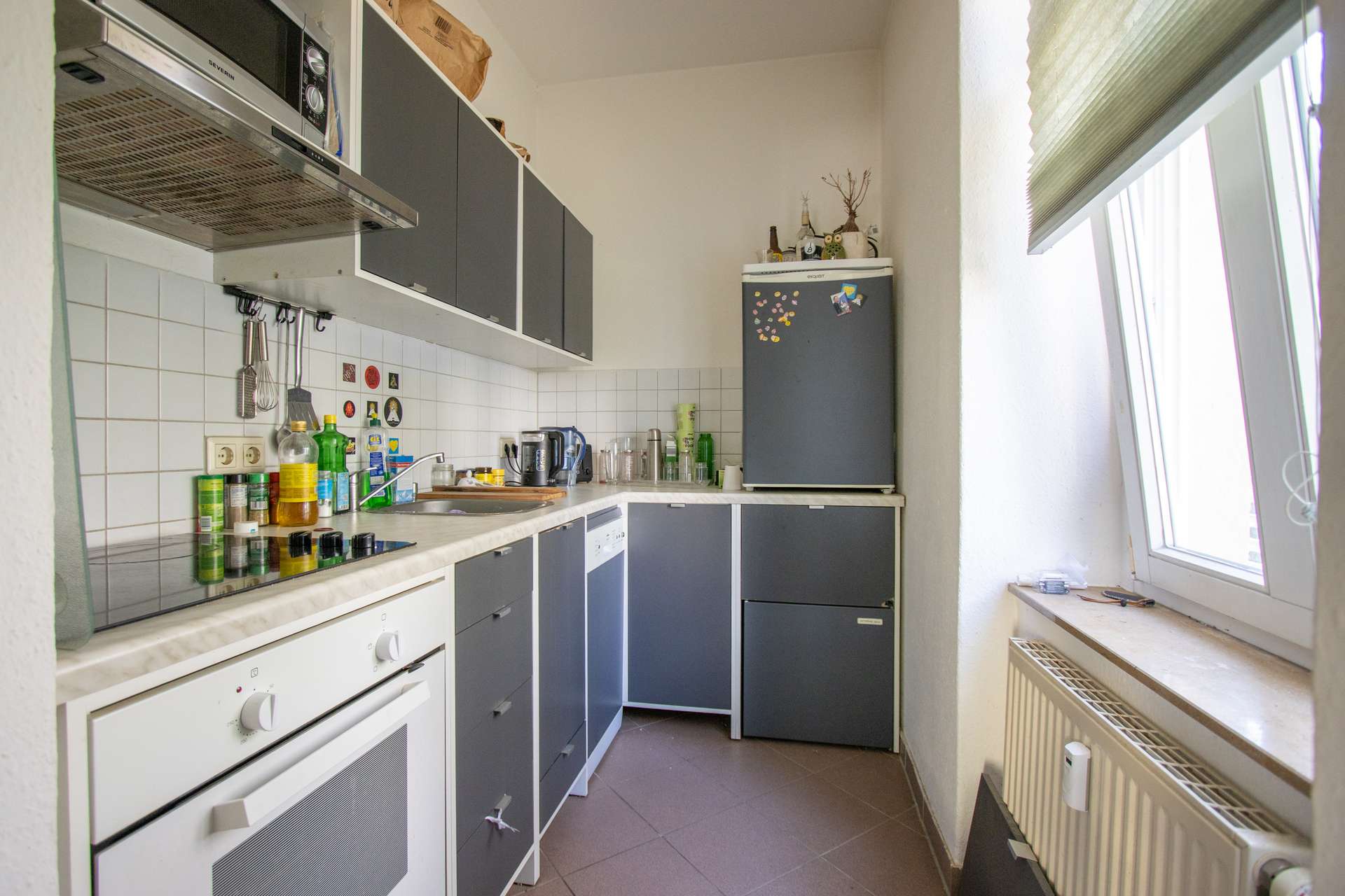 Der Flur ist gefliest und bietet ausreichend Platz für die Garderobe und Schuhe. Das geräumige Wohnzimmer ist mit einem Laminatboden ausgestattet und bietet mit einer Fläche von ca. 19 m² viele Möglichkeiten zur individuellen Möblierung. Durch das große Fenster wird die Wohnung auch im Hochparterre mit reichlich Tageslicht versorgt.