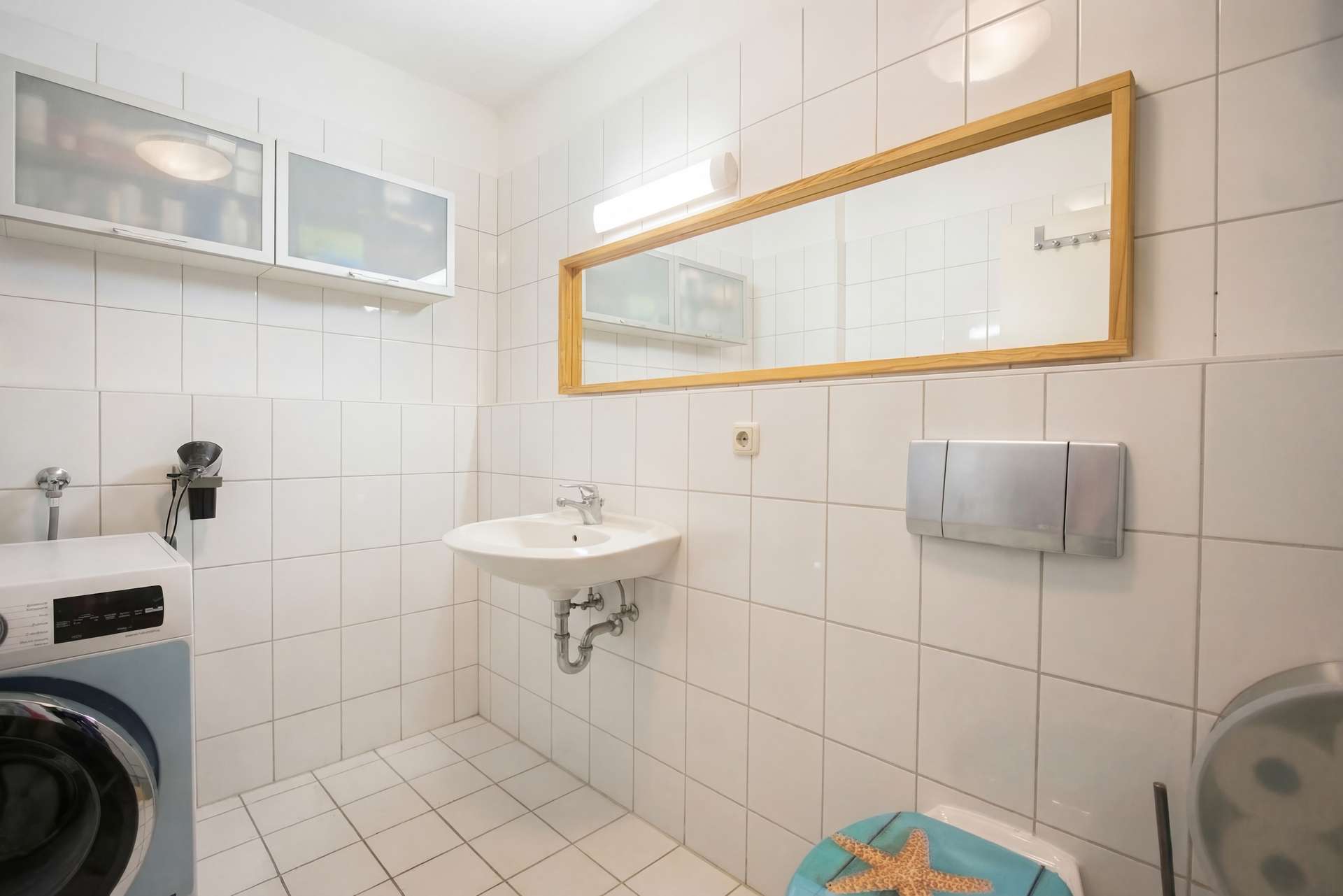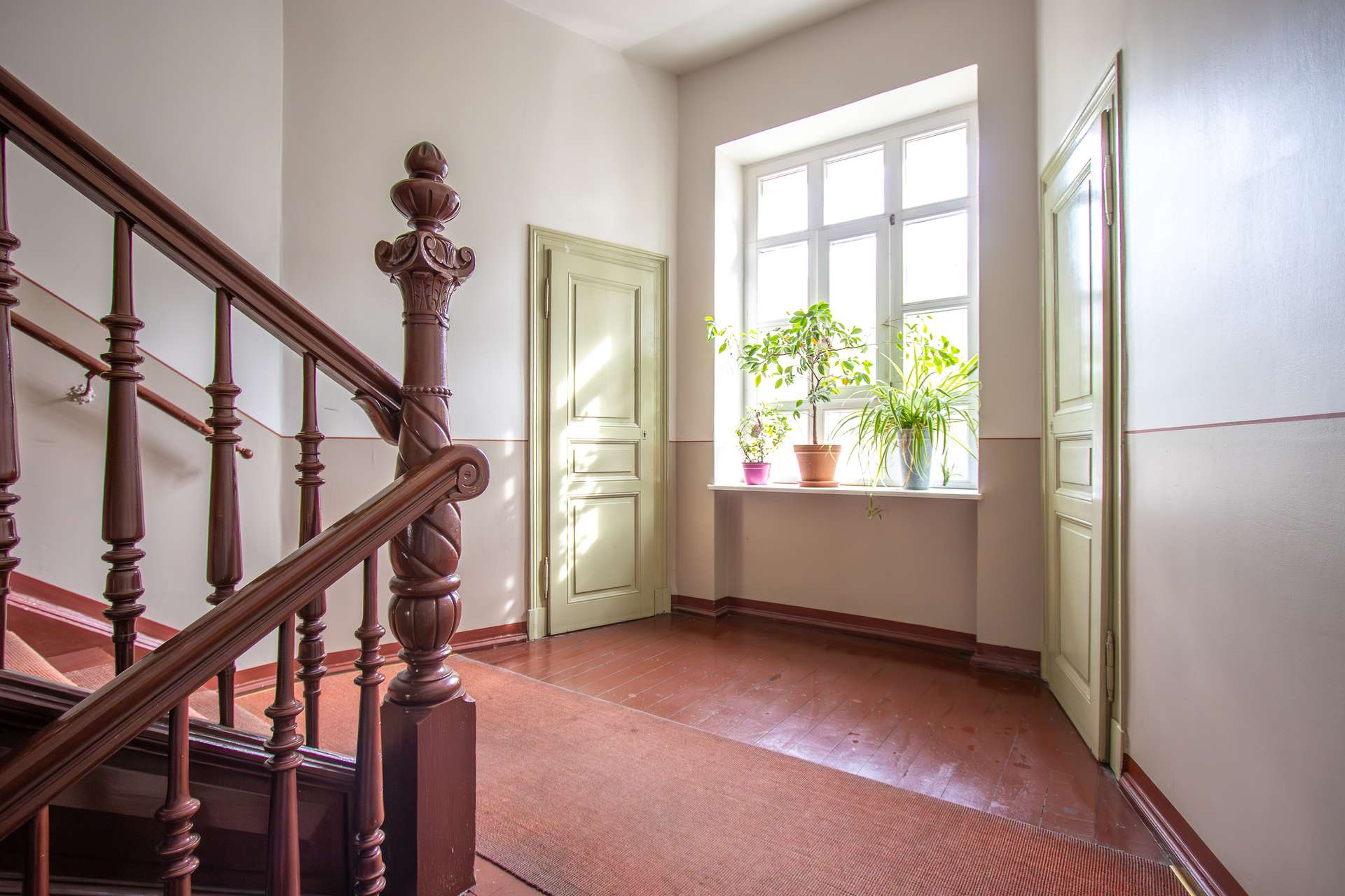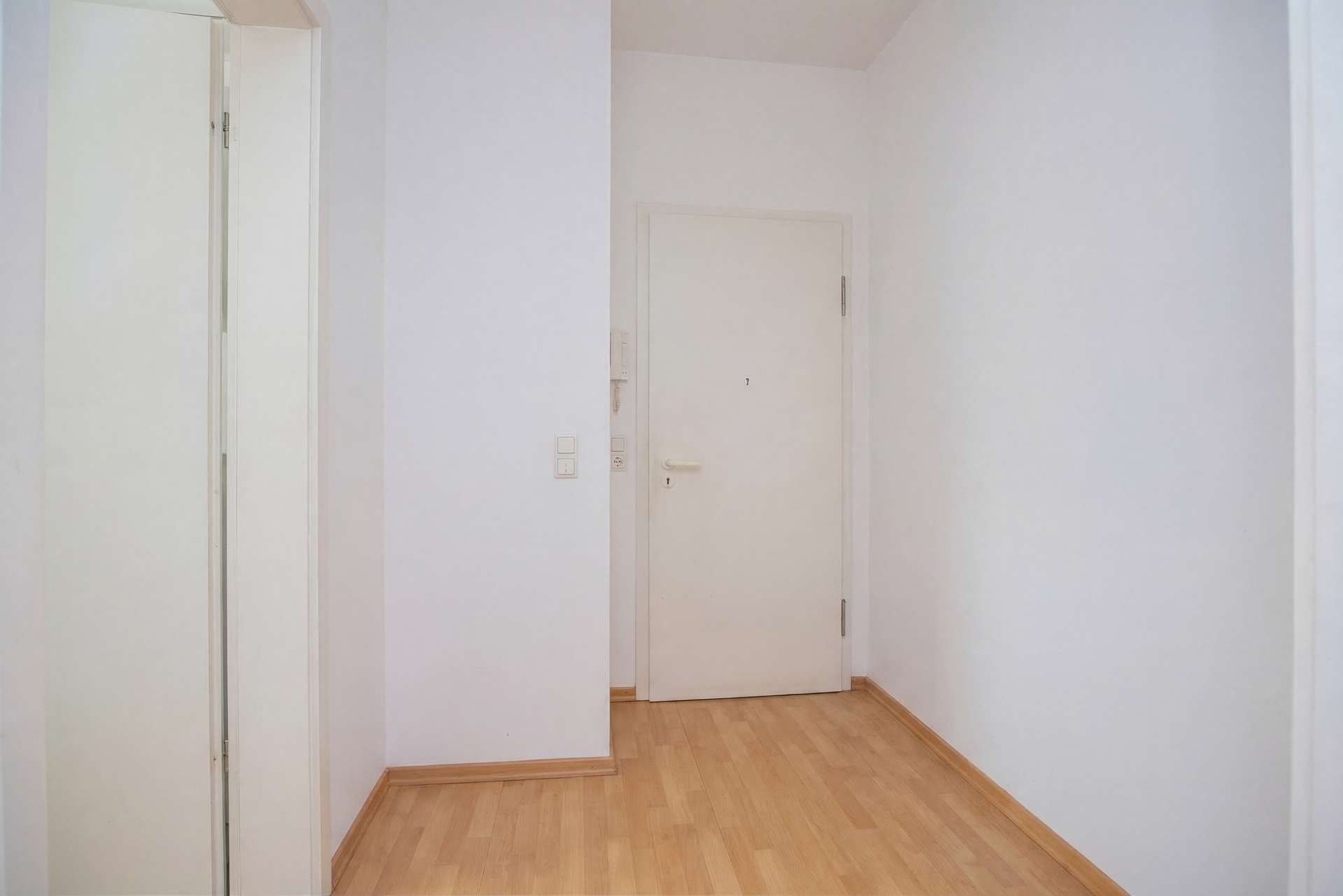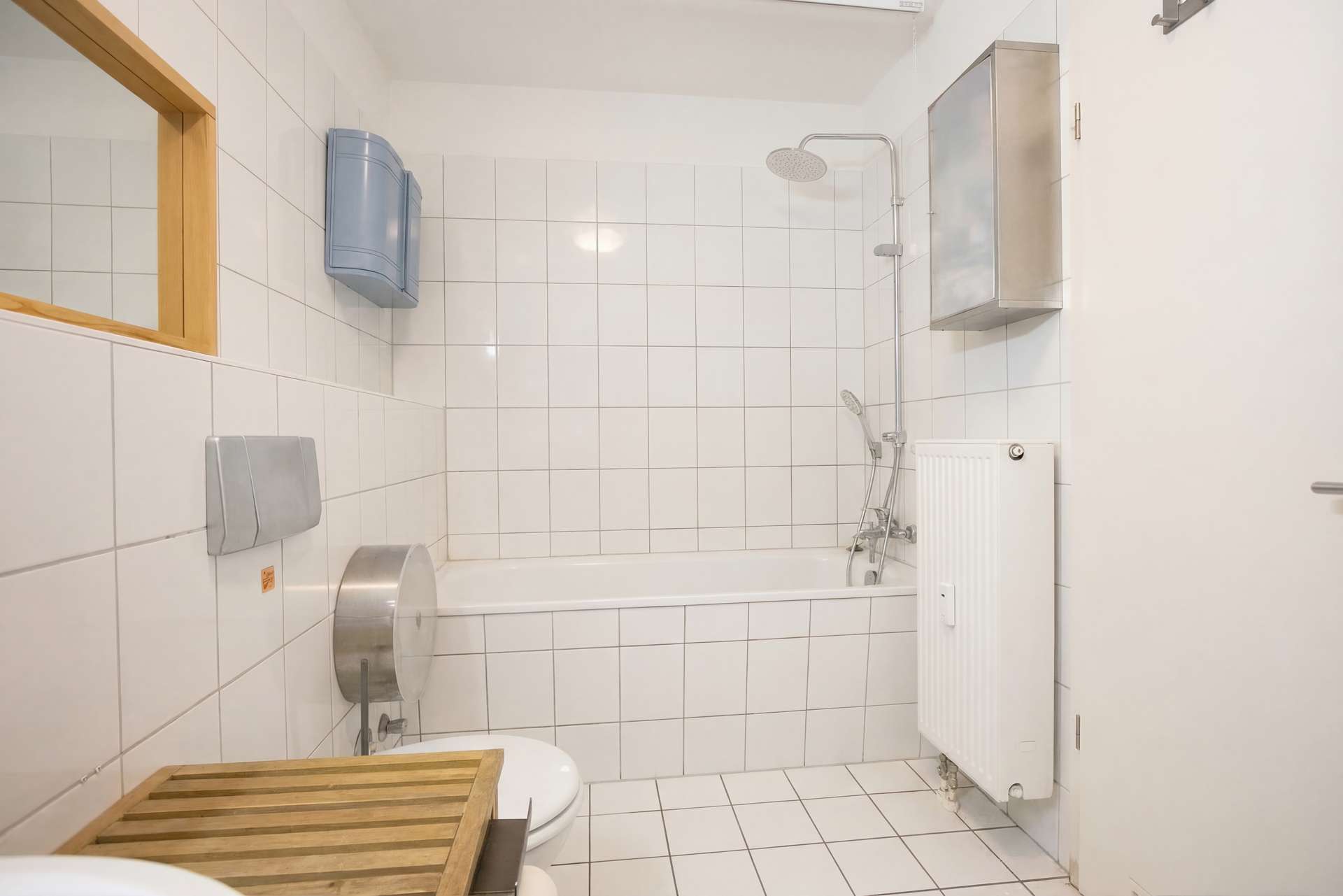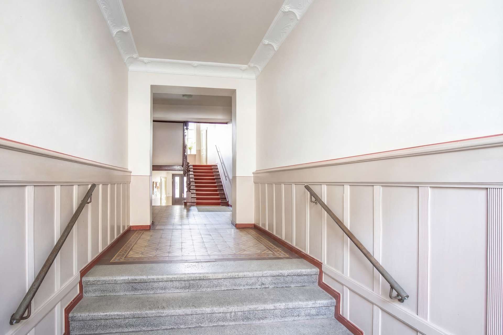 Die Wohnung ist über das repräsentative Treppenhaus erreichbar. Bereits beim Betreten vermittelt der Flur einen angenehmen ersten Eindruck und bietet Platz für eine Garderobe sowie Schuhschränke. Rechter Hand befindet sich das funktional geschnittene Badezimmer, das mit einer Badewanne und einem Waschmaschinenanschluss ausgestattet ist.
