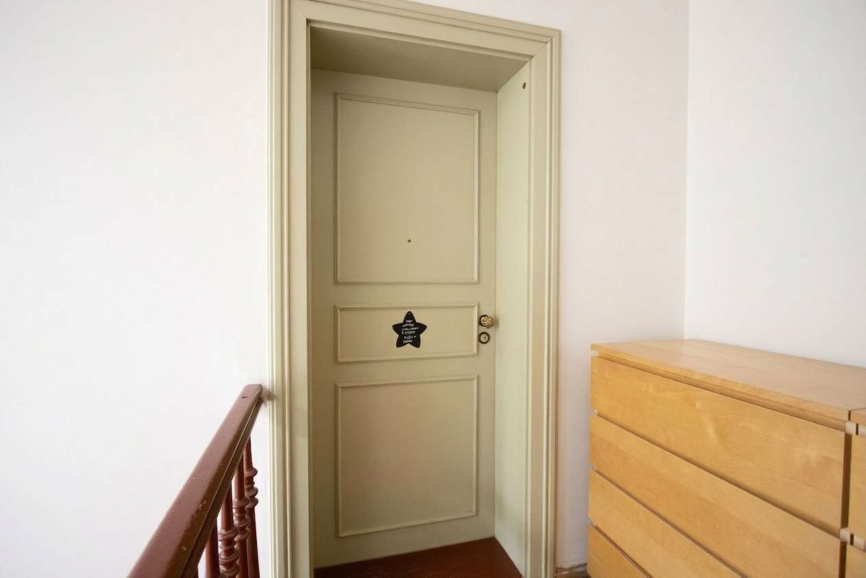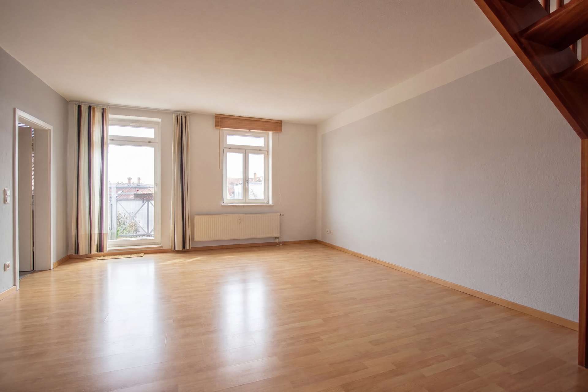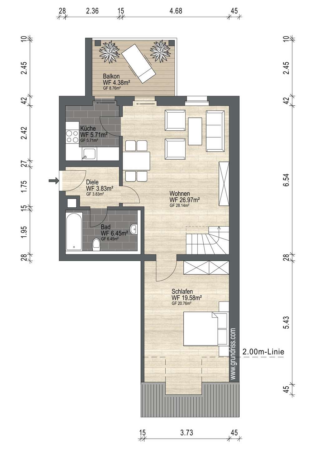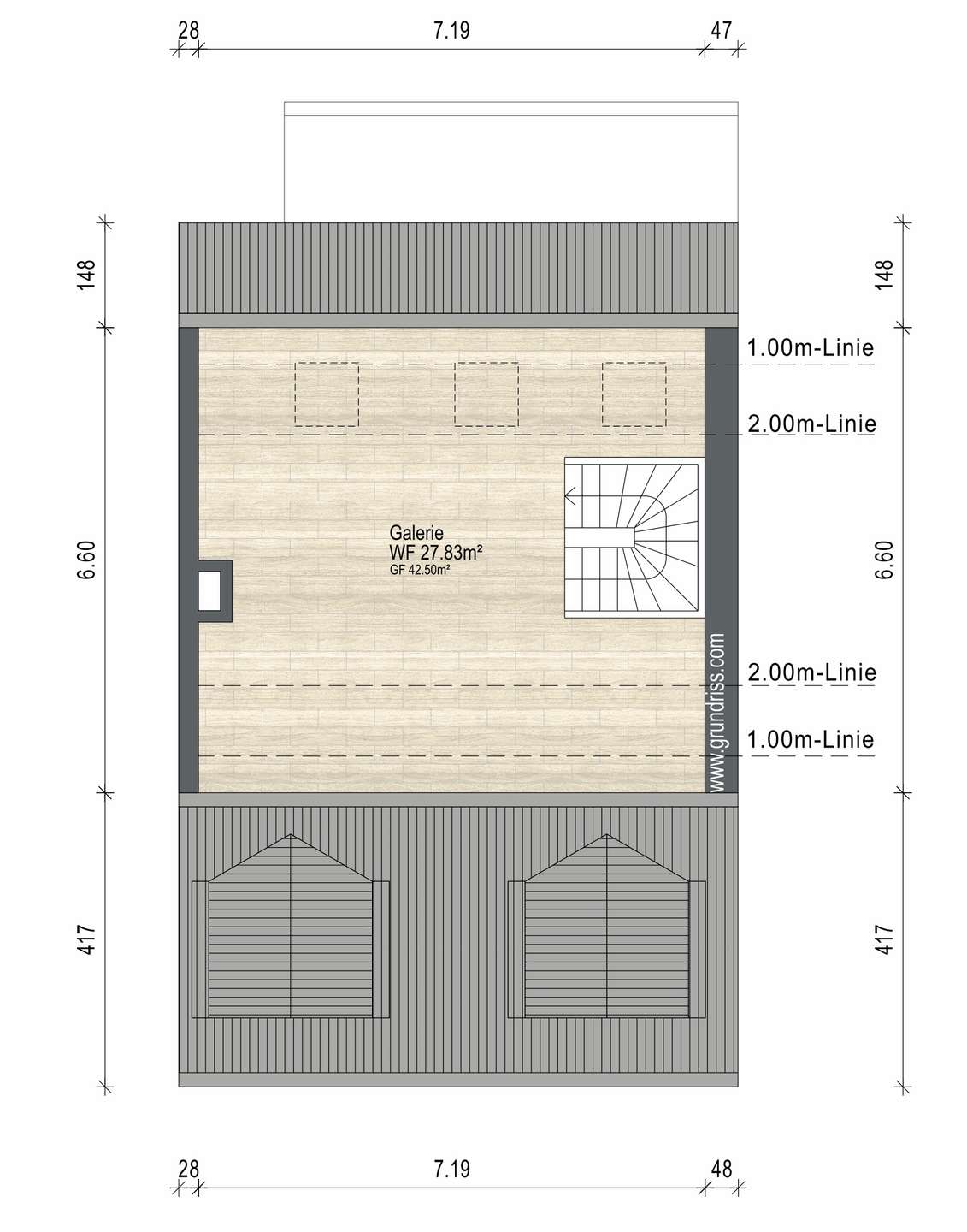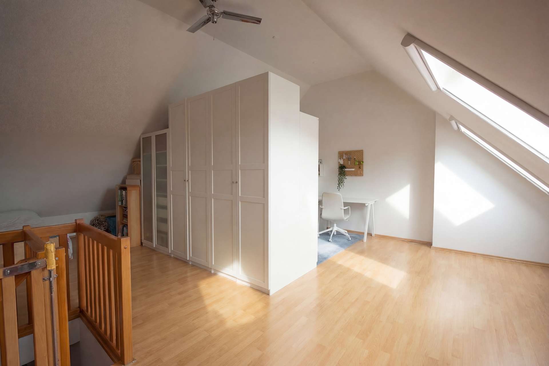 Über eine ansprechende Holztreppe erreicht man die obere Ebene der Maisonettewohnung. Dieser offen gestaltete Bereich eröffnet vielfältige Nutzungsmöglichkeiten, etwa als Schlaf-, Kinder-, Arbeits- oder kombinierter Hobbybereich. Besonders hervorzuheben ist die großzügige Raumhöhe von ca. 3,45 m, die diesem Bereich ein besonderes Wohngefühl verleiht.