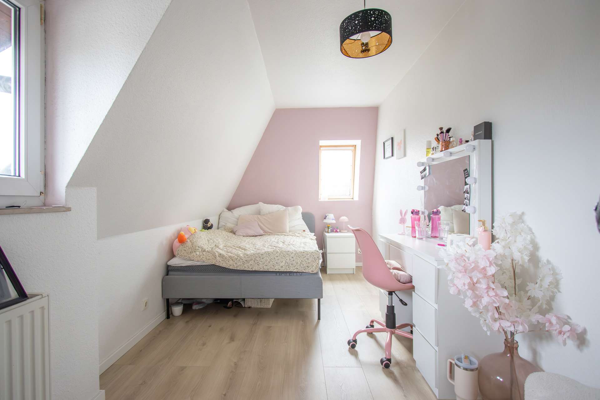 Über eine innenliegende Treppe gelangen Sie in die obere Ebene. Hier stehen Ihnen ein weiteres Zimmer – ideal als Kinder-, Gäste- oder Arbeitszimmer – sowie ein zweites Badezimmer mit Badewanne zur Verfügung.