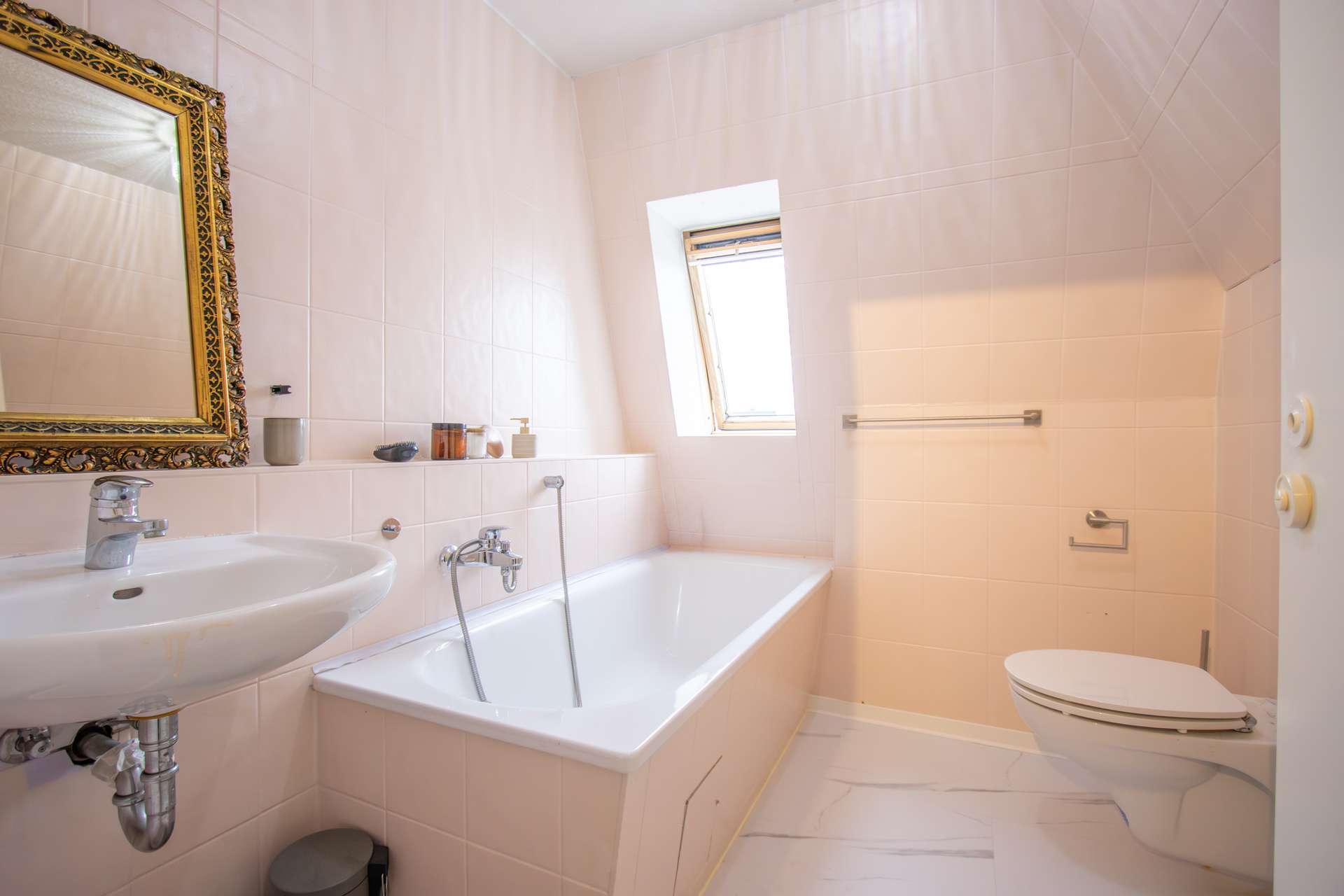 Ebenfalls auf dieser Ebene befindet sich das geräumige Hauptschlafzimmer, das dank seines optimalen Zuschnitts ausreichend Platz für ein großes Bett und einen großzügigen Kleiderschrank bietet. Ein Erker verleiht dem Raum eine individuelle Note und unterstreicht den besonderen Charakter der Wohnung. Angrenzend liegt das erste Badezimmer mit Dusche, Waschmaschinenanschluss und WC.