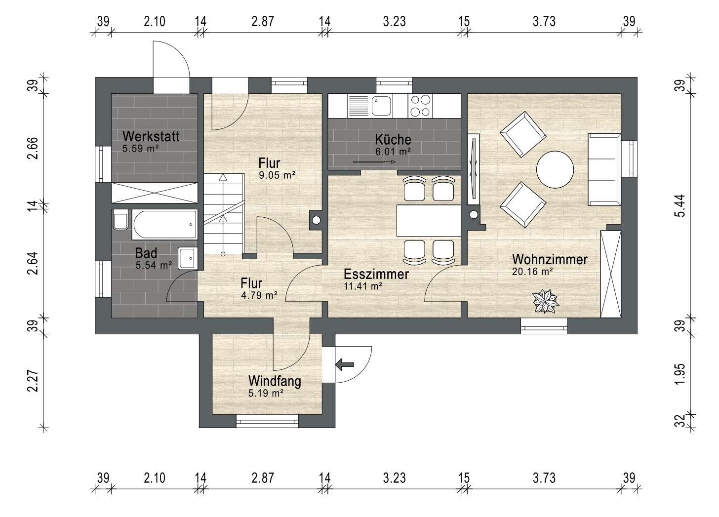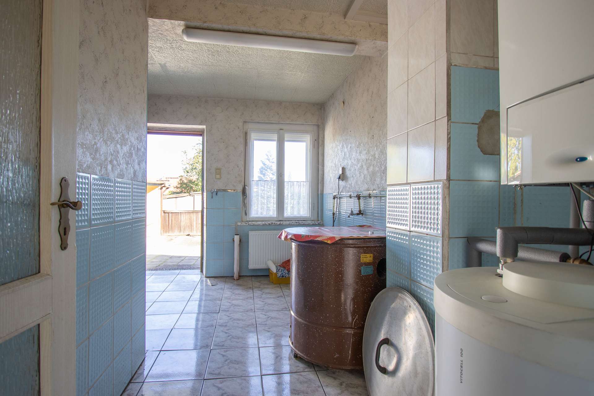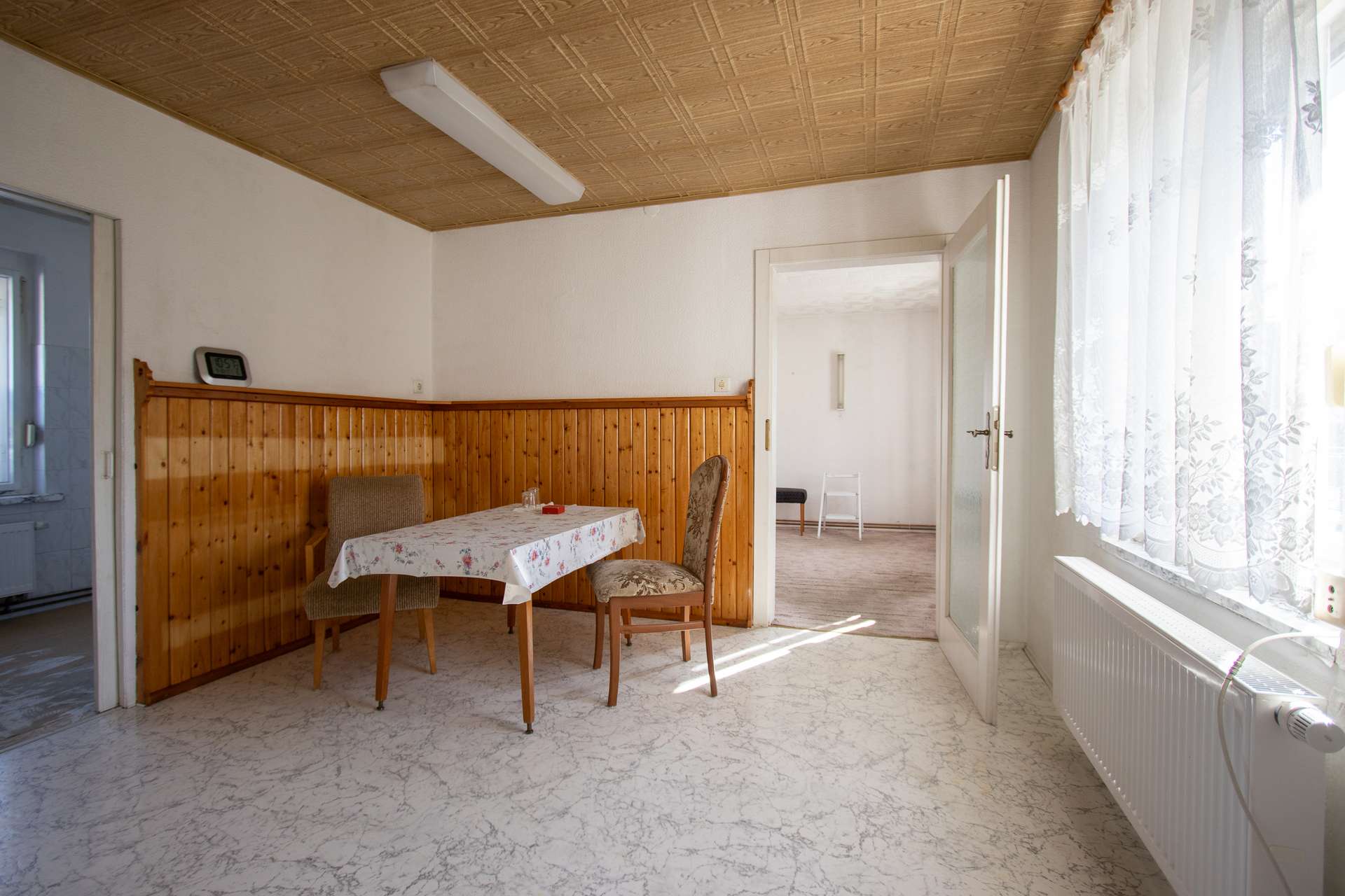 Das Haus betritt man über den angebauten Windfang, der aufgrund des großen Fensters einen hellen und einladenden Eingangsbereich bietet. Der Windfang ist gleichzeitig auch ein praktischer Platz für die Garderobe und Schuhschrank. Im Erdgeschoss befindet die zweckmäßig geschnittene Küche mit dem direkt angrenzenden Esszimmer, welches den Durchgang zum geräumigen Wohnzimmer darstellt. Das Wohnzimmer überzeugt ebenfalls mit sehr guten Lichtverhältnissen aufgrund der großen Fenster in Richtung Osten und Süden. Das Badezimmer wurde in den 90er Jahren saniert und ist mit einer Badewanne, WC und Waschbecken ausgestattet. Bei Bedarf wäre eine Vergrößerung des Badezimmers unter Einbeziehung des angrenzenden Werkstattraumes möglich.