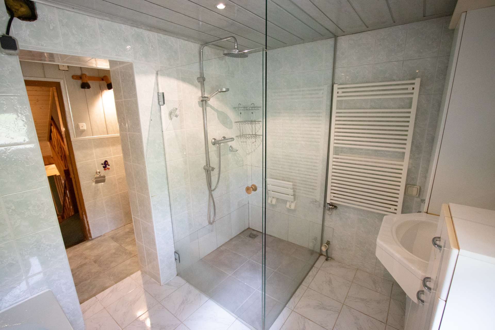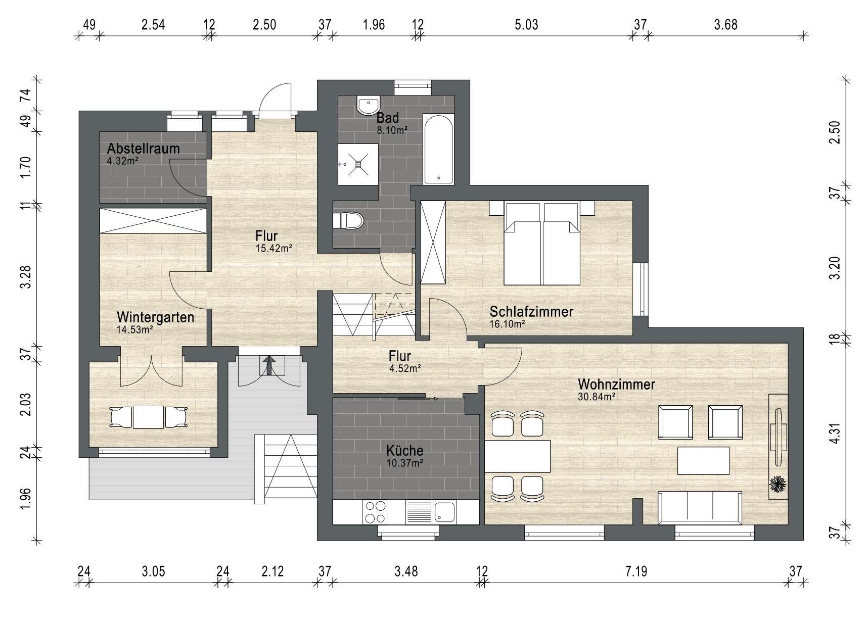 Das Erdgeschoss betritt man über die große Diele, an die sich linker Hand der Wintergarten anschließt. Ein schöner Platz, um in Ruhe einen Kaffee zu genießen und dabei durch die große Glasfront mit Schiebetür den Blick ins Grüne zu schweifen zu lassen. Gegenüber gelangt man zur Küche und zum großzügig geschnittenen Wohnzimmer, welches mit über 30 m² viel Platz für Ihre Einrichtungsideen bietet. Durch die großen Fenster in Verbindung mit der Ausrichtung nach Süden bietet der Wohnbereich zudem ideale Lichtverhältnisse. Nebenan befindet sich ein zweckmäßig geschnittenes Schlafzimmer. Ein Außenrollladen sorgt hier für optimale Verdunkelung. Das Badezimmer im Erdgeschoss ist mit einer bodengleichen Dusche sowie einer Badewanne und WC ausgestattet.