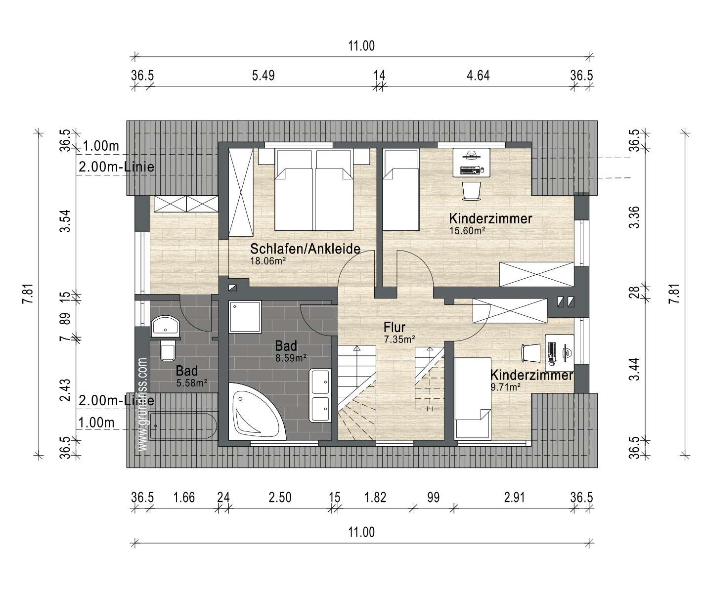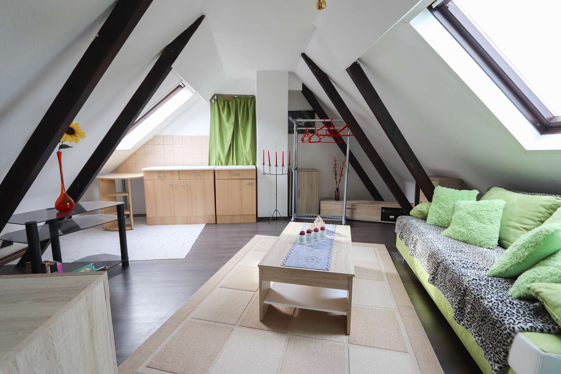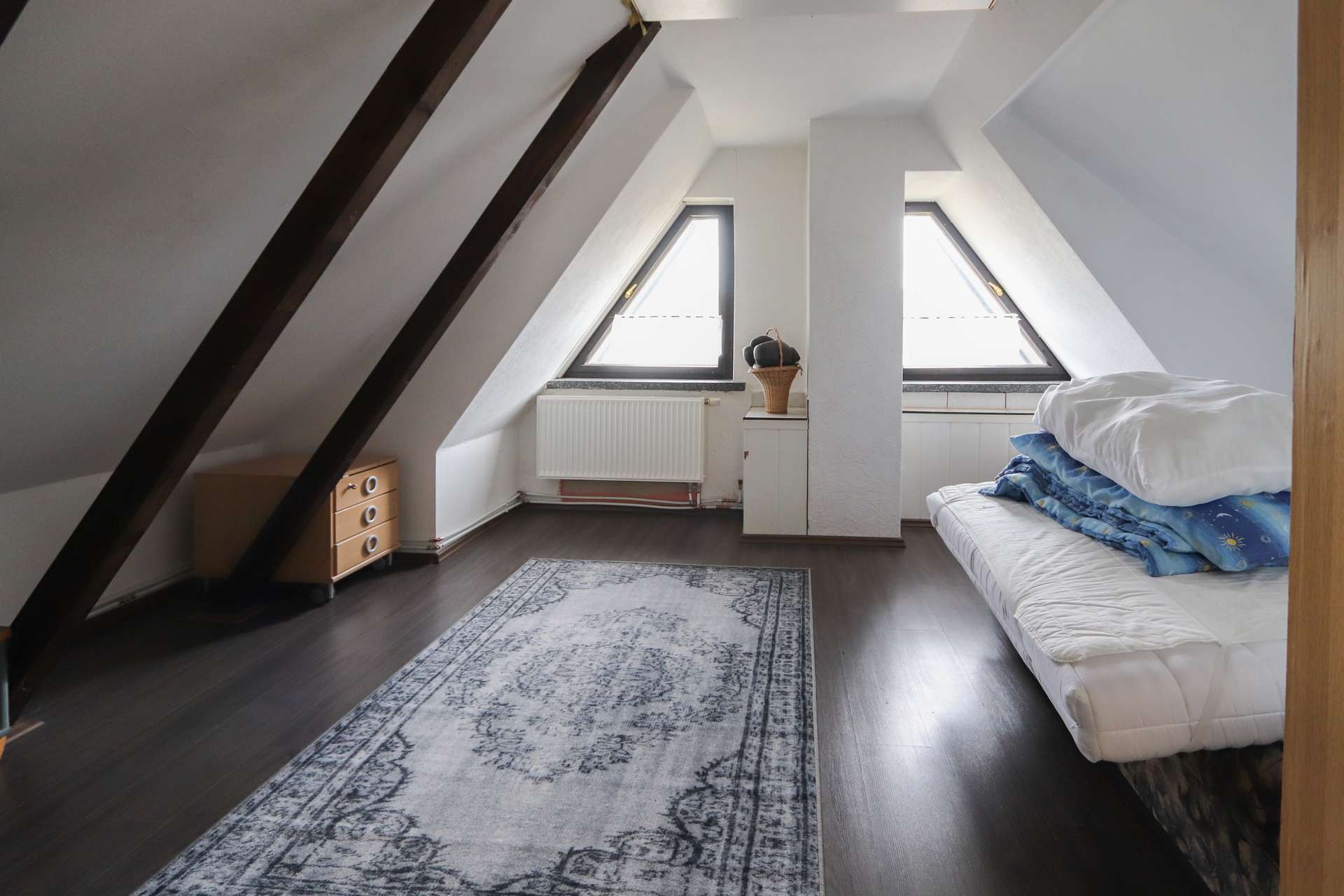 Eine Holztreppe führt hinauf in das voll ausgebaute Dachgeschoss, wo sich 2 weitere Zimmer befinden, die ebenfalls viel Platz für Ihre Ideen und einen tollen Ausblick bieten.