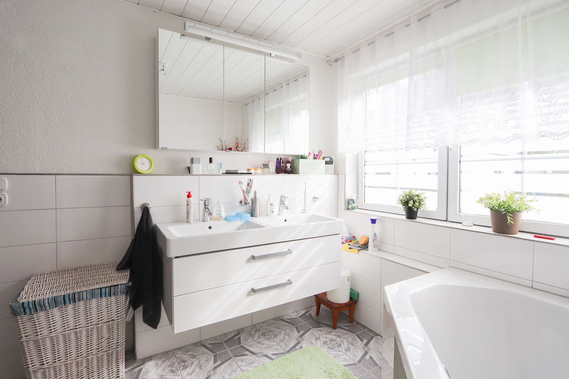 Im Obergeschoss befinden sich insgesamt 3 Schlaf-/Kinderzimmer. An das Hauptschlafzimmer schließt sich ein Ankleidebereich sowie ein Bad en suite mit WC und Badewanne an. Ein zweites Badezimmer, welches direkt vom Flur aus erreichbar ist, wurde bereits geschmackvoll modernisiert. Es verfügt über eine Badewanne, eine große Dusche sowie ein Doppelwaschbecken.