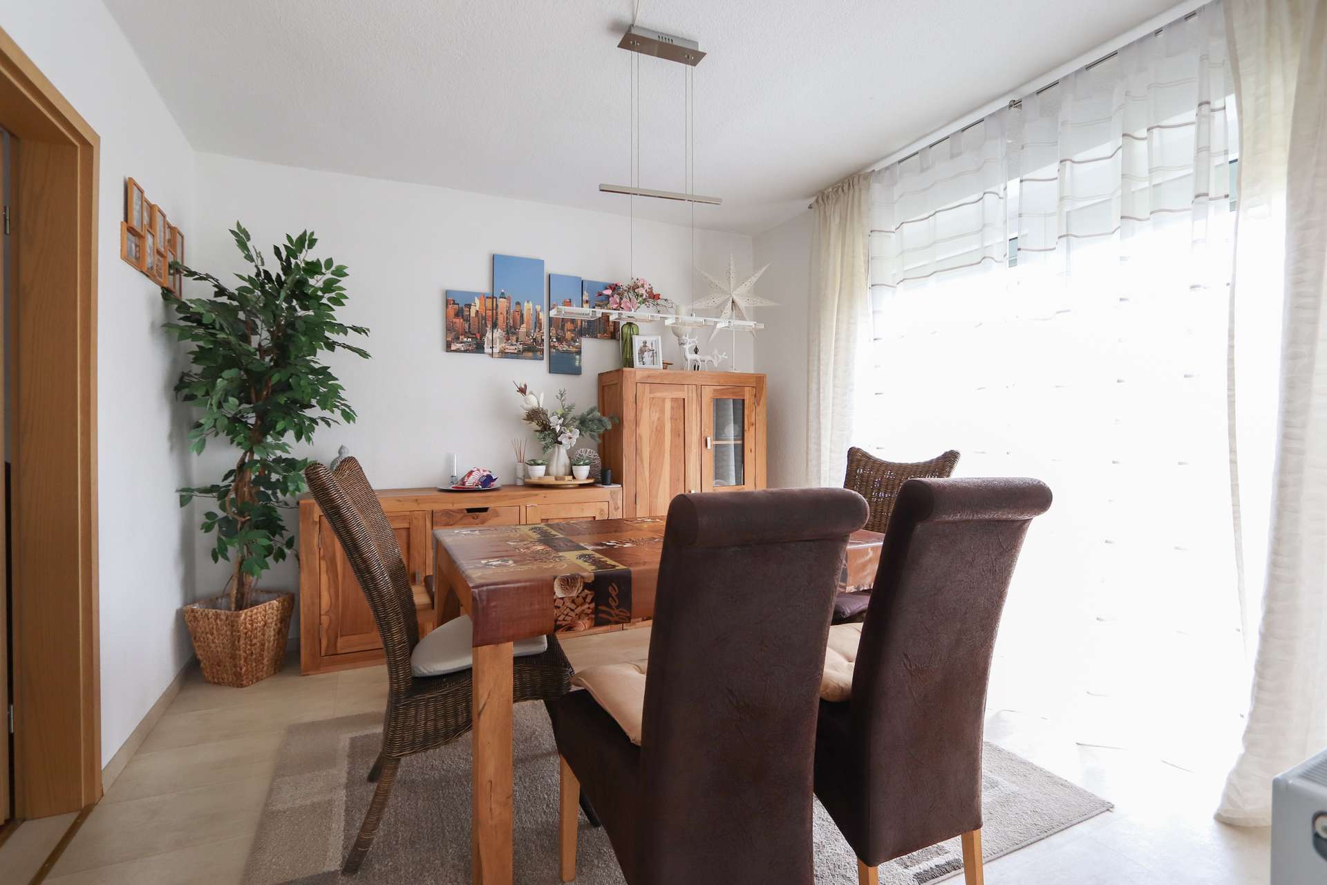 Das Haus betritt man über einen praktischen Windfang. Die Haustür wurde erst im vergangenen Jahr erneuert. Es schließt sich der ebenfalls erst 2023 neu geflieste Flurbereich an. Das Wohnzimmer besticht durch eine große Fensterfront und einen gemauerten Kamin, der nicht nur für angenehme Wärme sondern auch eine gemütliche Atmosphäre in der kühlen Jahreszeit sorgt. An das Wohnzimmer grenzt das Esszimmer an, das direkt mit der Küche verbunden ist. Die Küche ist mit einer top gepflegten Einbauküche aus dem Jahr 2016 ausgestattet. Sie überzeugt durch viel Arbeitsfläche und Stauraum. Im Erdgeschoss ist zudem ein praktischer Hauswirtschaftsraum mit WM-Anschluss und Spülbecken sowie ein Gäste-WC angeordnet, welches im Jahr 2017 modernisiert wurde.