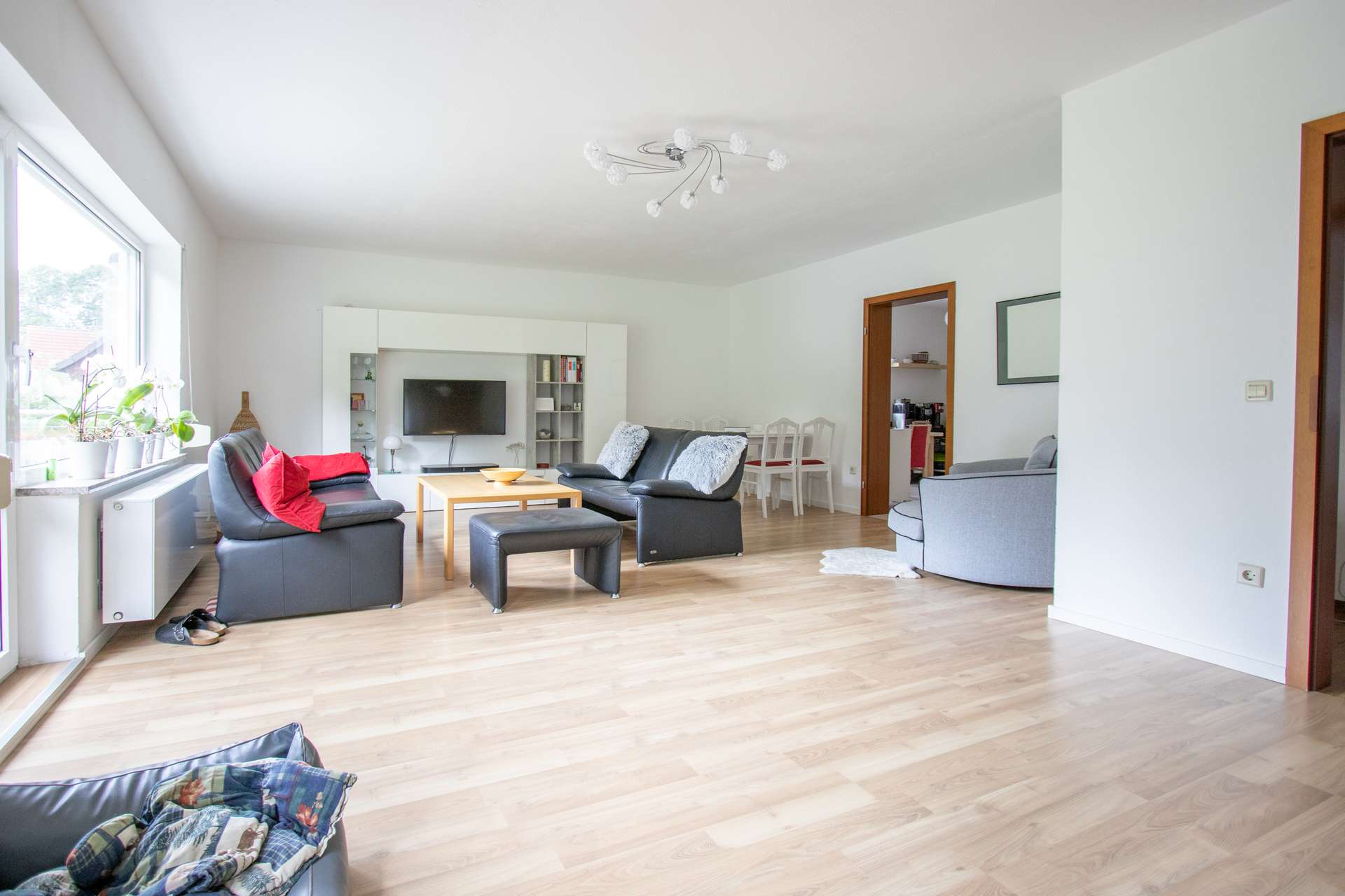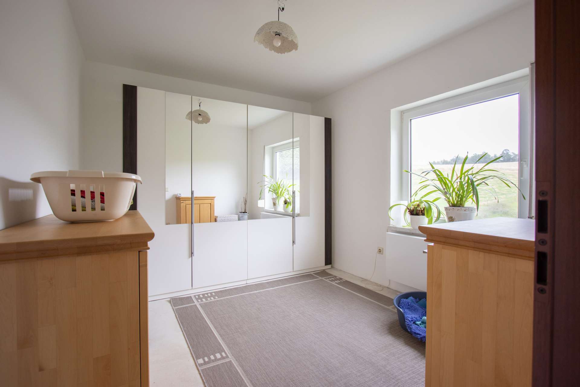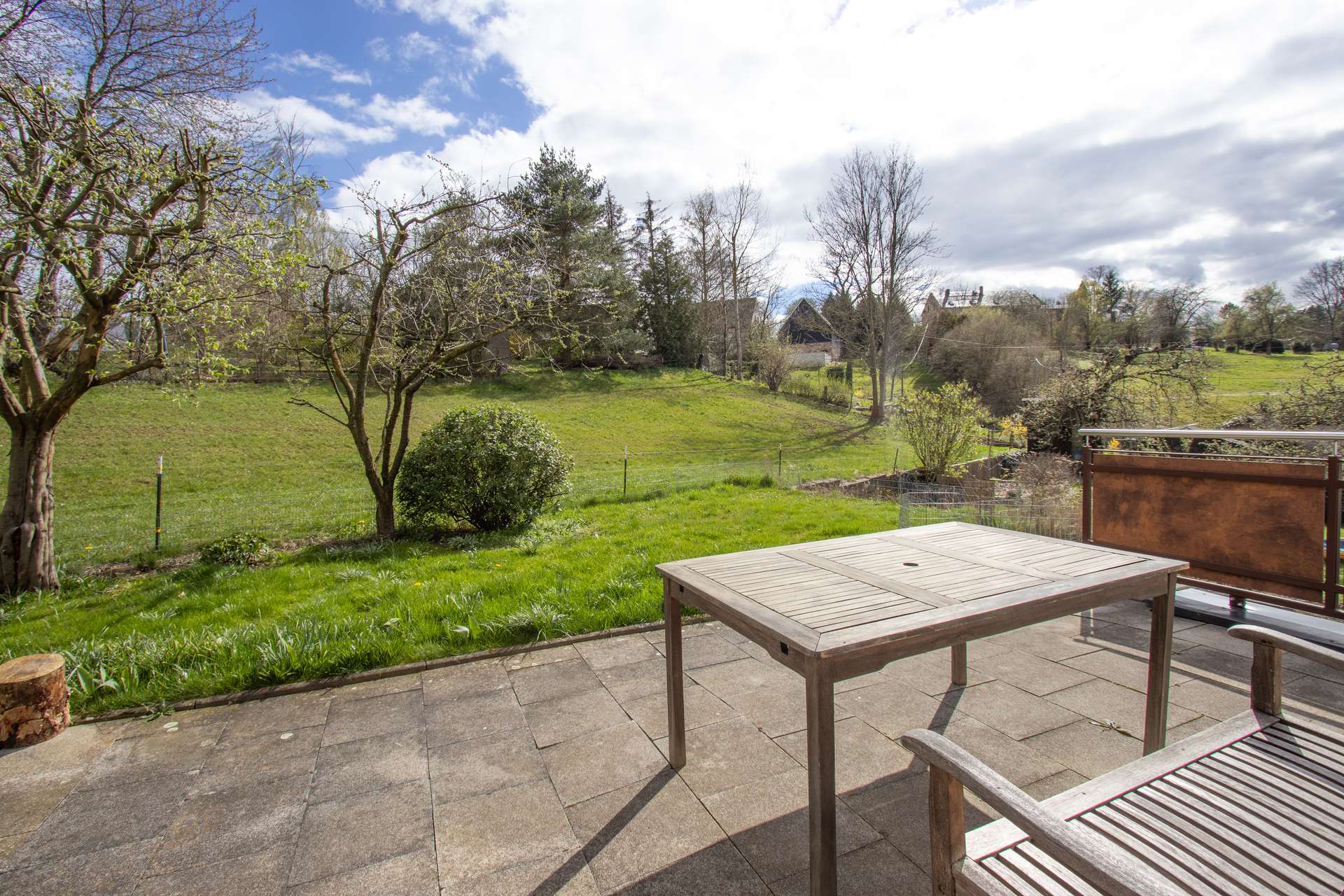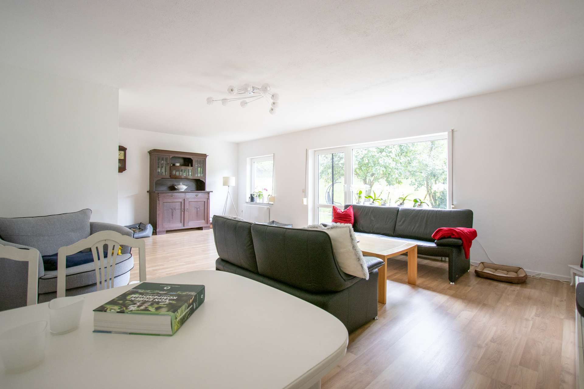 Im Erdgeschoss befinden sich neben 2 Schlafzimmern und einem Bad mit Wanne und Dusche auch das Wohnzimmer, welches mit 37 m² großzügig bemessen ist und ein tolles Raumgefühl und viel Platz für Ihre individuellen Einrichtungsideen bietet. Von hier gelangt man auf die sonnige Südterrasse, die einen schönen Blick ins Grüne und auf die benachbarten Weideflächen bietet. Hier lässt es sich wunderbar entspannen und vom Alltag abschalten. Die Küche grenzt ebenfalls an das Wohnzimmer an. Sie ist mit einer Einbauküche ausgestattet und bietet bei Bedarf auch Platz für einen Essbereich.