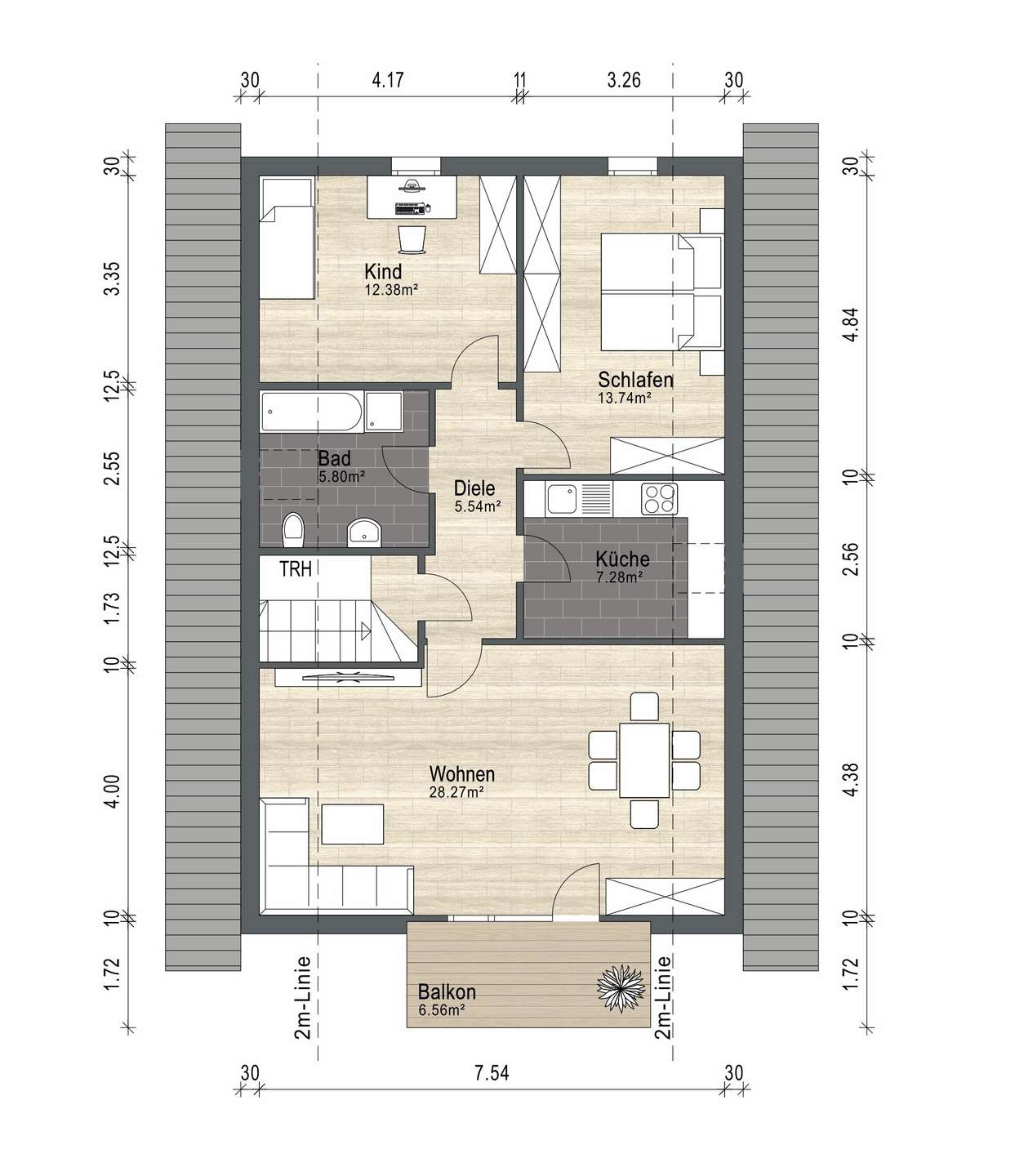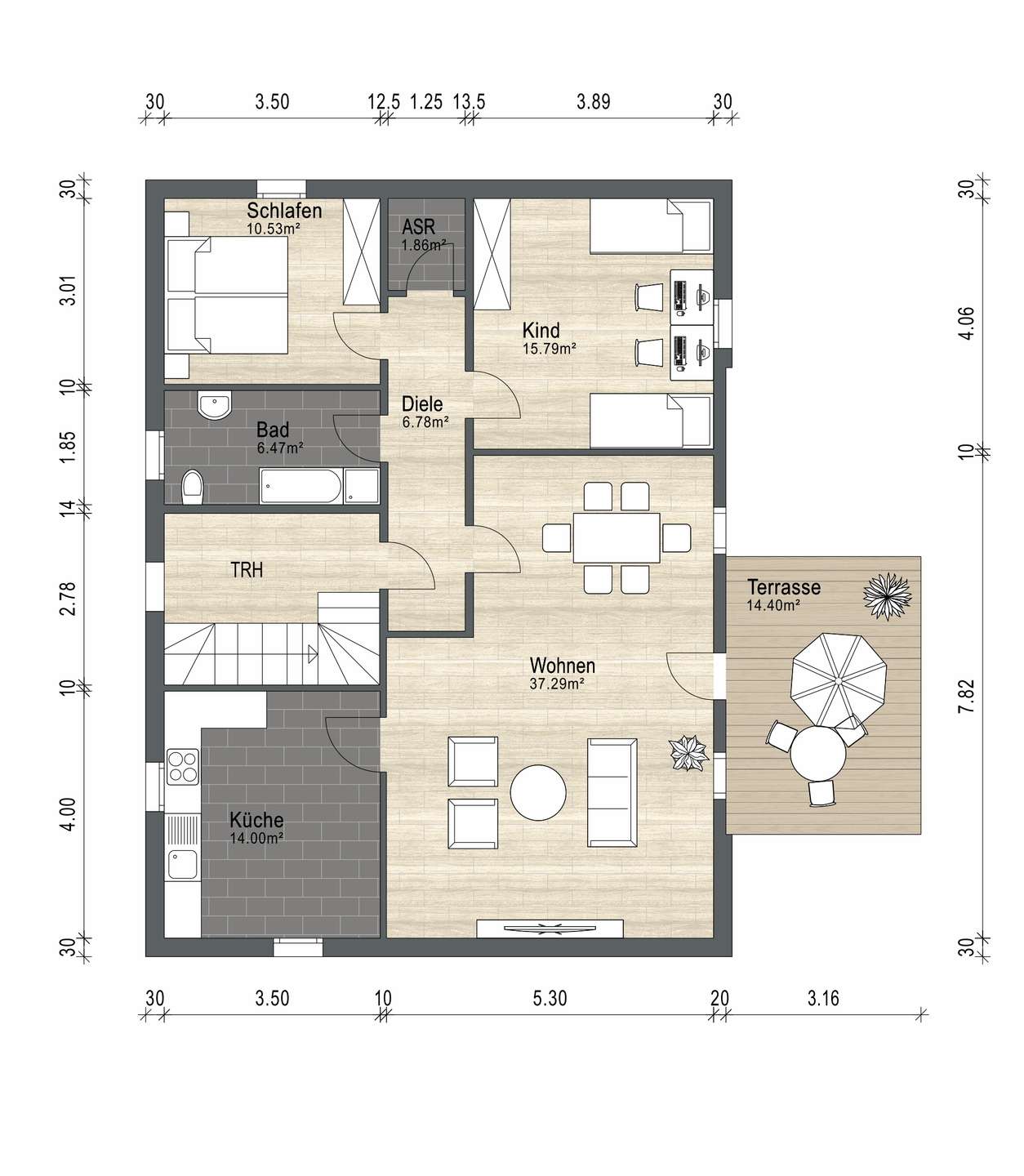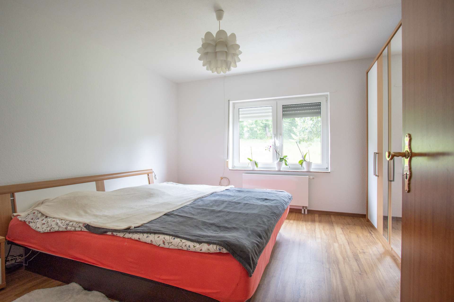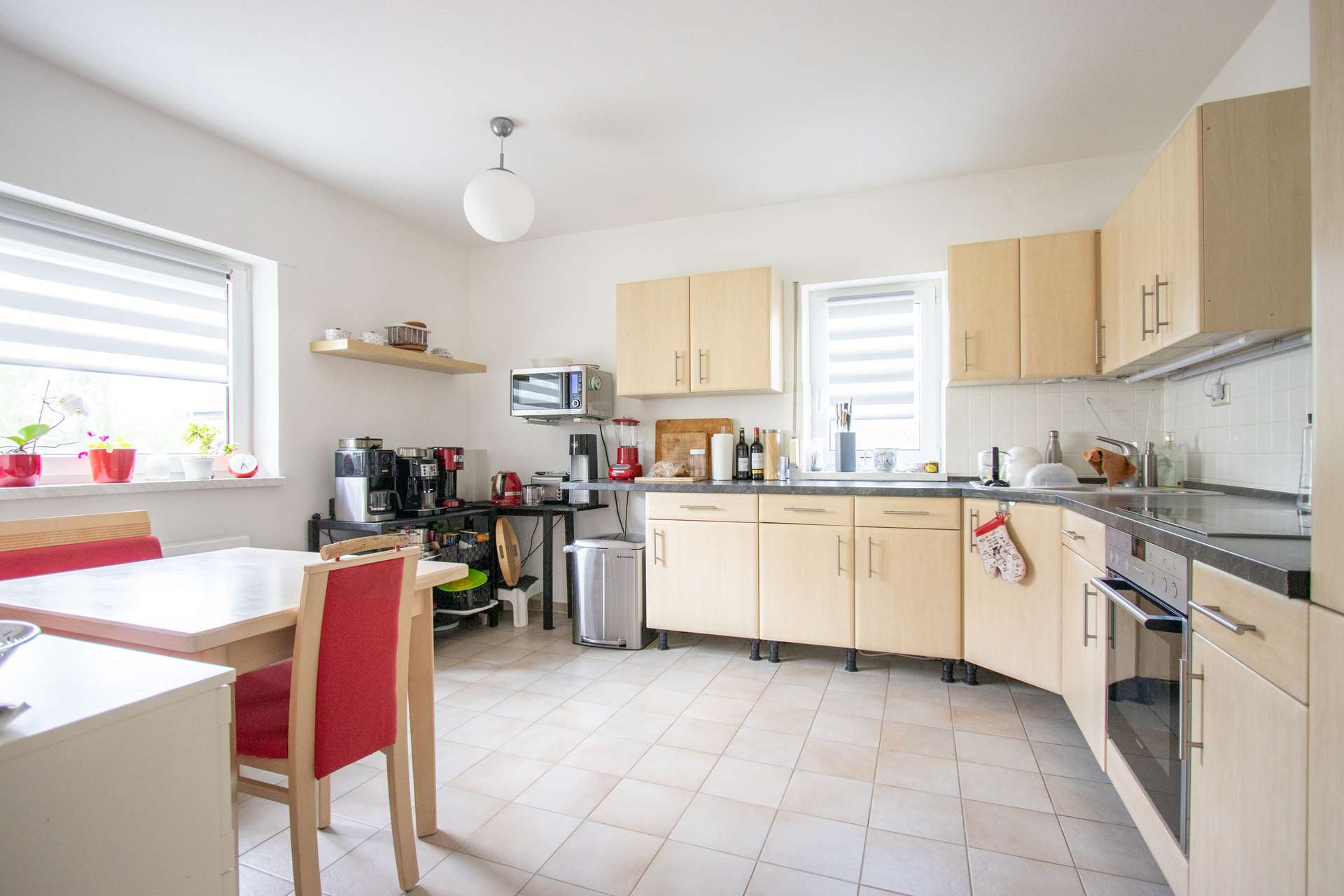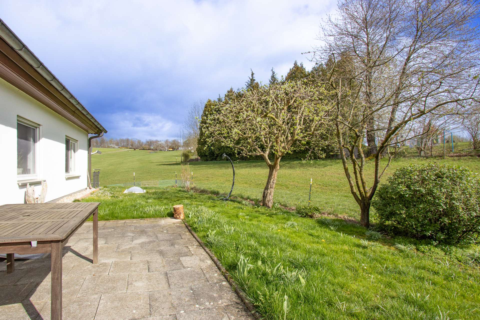 Im Erdgeschoss befinden sich neben 2 Schlafzimmern und einem Bad mit Wanne und Dusche auch das Wohnzimmer, welches mit 37 m² großzügig bemessen ist und ein tolles Raumgefühl und viel Platz für Ihre individuellen Einrichtungsideen bietet. Von hier gelangt man auf die sonnige Südterrasse, die einen schönen Blick ins Grüne und auf die benachbarten Weideflächen bietet. Hier lässt es sich wunderbar entspannen und vom Alltag abschalten. Die Küche grenzt ebenfalls an das Wohnzimmer an. Sie ist mit einer Einbauküche ausgestattet und bietet bei Bedarf auch Platz für einen Essbereich.