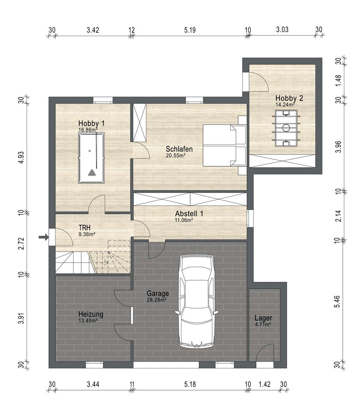 So befinden sich hier 2 große, helle Zimmer, die z.B. als Hobby-, Kinder-, oder Arbeitszimmer genutzt werden können. Des Weiteren sind in diesem Geschoss ein Gäste-WC sowie eine große Garage mit elektrischem Sektionaltor und der Heizungsraum angeordnet.