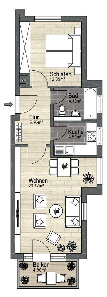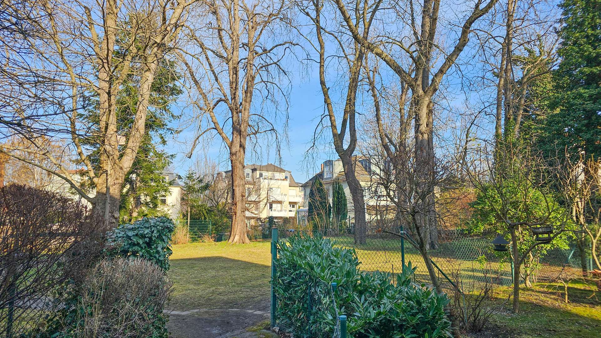 Die Wohnung erreicht man über das helle und mit Naturstein geflieste Treppenhaus. Der Flur ist zweckmäßig geschnitten und bietet Platz für die Garderobe und einen Schuhschrank. Die Wohnung ist mit einem Parkettboden ausgestattet. Für Komfort und eine optimale Wärmeverteilung sorgt eine Fußbodenheizung. Das geräumige Wohnzimmer überzeugt durch seine besonders guten Lichtverhältnisse aufgrund der Ausrichtung nach Süden in Verbindung mit den großen, teilweise bodentiefen Fenstern. Sowohl ein gemütlicher Sitzbereich als auch ein Esstisch finden hier problemlos ihren Platz. Auf dem angrenzenden, sonnigen Balkon lässt es sich mit Blick in die grüne Umgebung im Sommer wunderbar entspannen. Für Schatten sorgt bei Bedarf eine Markise. Des Weiteren findet man an allen Fenstern Außenrollläden vor. Das zeitlos geflieste Badezimmer verfügt über ein Fenster zur optimalen Belüftung und ist mit einer Badewanne ausgestattet. Die nebenan befindliche Küche ist ebenfalls gefliest und mit einer mietereigenen Einbauküche ausgestattet. Das nach Norden ausgerichtete Schlafzimmer bietet aufgrund seines praktischen Zuschnitts ausreichend Platz für ein großes Bett und einen geräumigen Kleiderschrank. Das bodentiefe Fenster sorgt für viel Tageslicht und einen schönen Blick in angrenzen kleinen Park mit imposanten Rosskastanien.