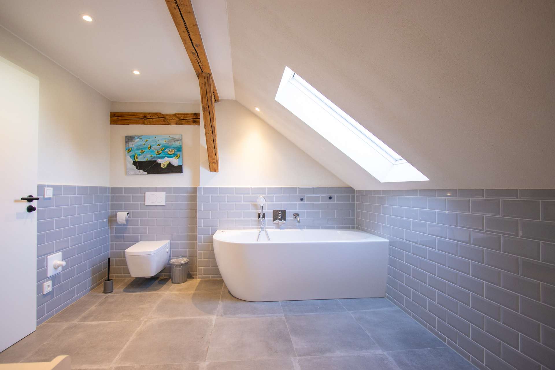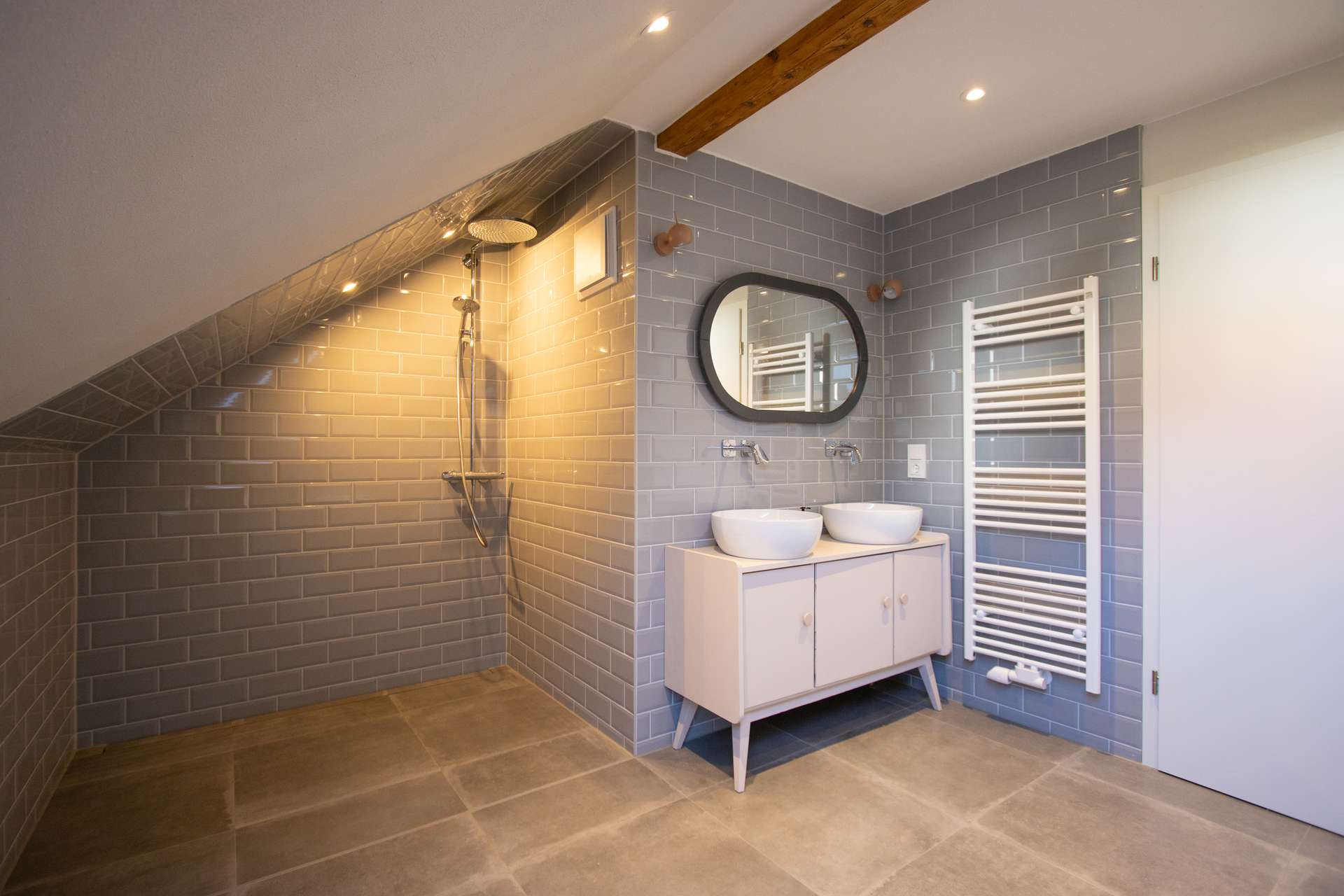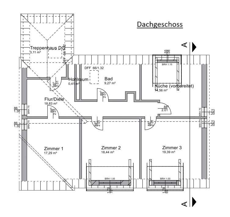 Das Dachgeschoss umfasst insgesamt 4 Zimmer und ein weiteres Bad. Die Räume können ideal als Kinderzimmer oder Büro genutzt werden. Das Badezimmer überzeugt mit einem anspruchsvollem Design und ist mit Walk-In-Shower sowie einer Badewanne und Doppel-Waschbecken ausgestattet. Eines der Zimmer verfügt über Küchenanschlüsse, sodass das Dachgeschoss bei Bedarf als unabhängige Wohneinheit genutzt werden kann. Die Sichtbalken sorgen für Charme und eine gemütliche Atmosphäre. Das Dachgeschoss wurde nach EnEV2016 ausgebaut und mit 16 cm Zwischensparrendämmung (Holzfaser) versehen. Die Nordseite des Daches wurde neu gedeckt, und die Giebel sowie der Drempel wurden mit 16 cm Holzfaser gedämmt. Die Geschossdecke des Erdgeschoss zum Obergeschoss ist mit 10 cm Mineralwolle gedämmt und verfügt über ca. 6 cm EPS unter dem Estrich.