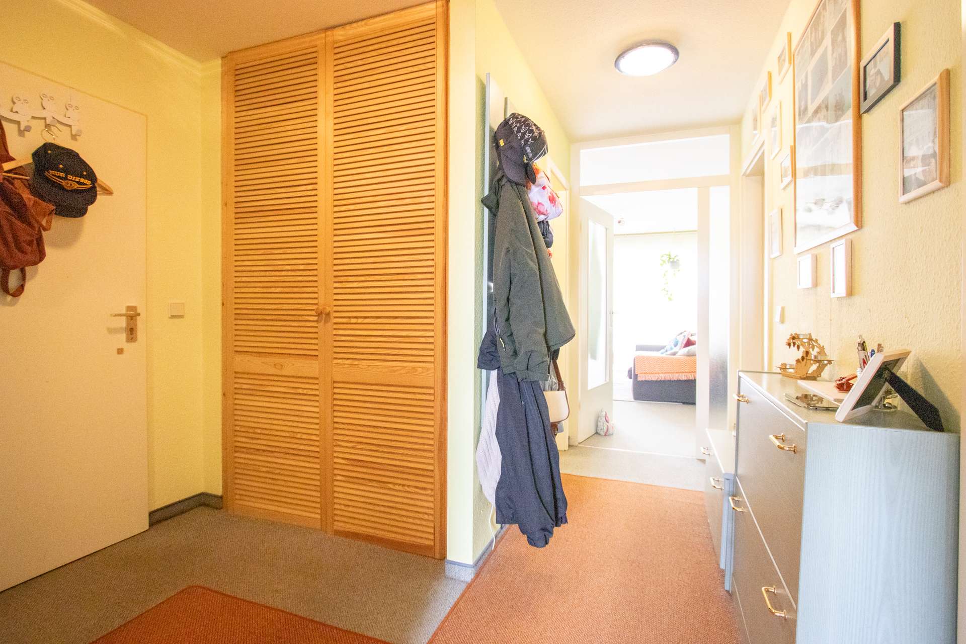 Der L-Förmig geschnittene Flur bietet ausreichend Platz für Garderobe und Schuhschrank. Sehr praktisch ist eine Nische im Flur, die mit Türen abgetrennt wurde und somit als Abstellraum dient.