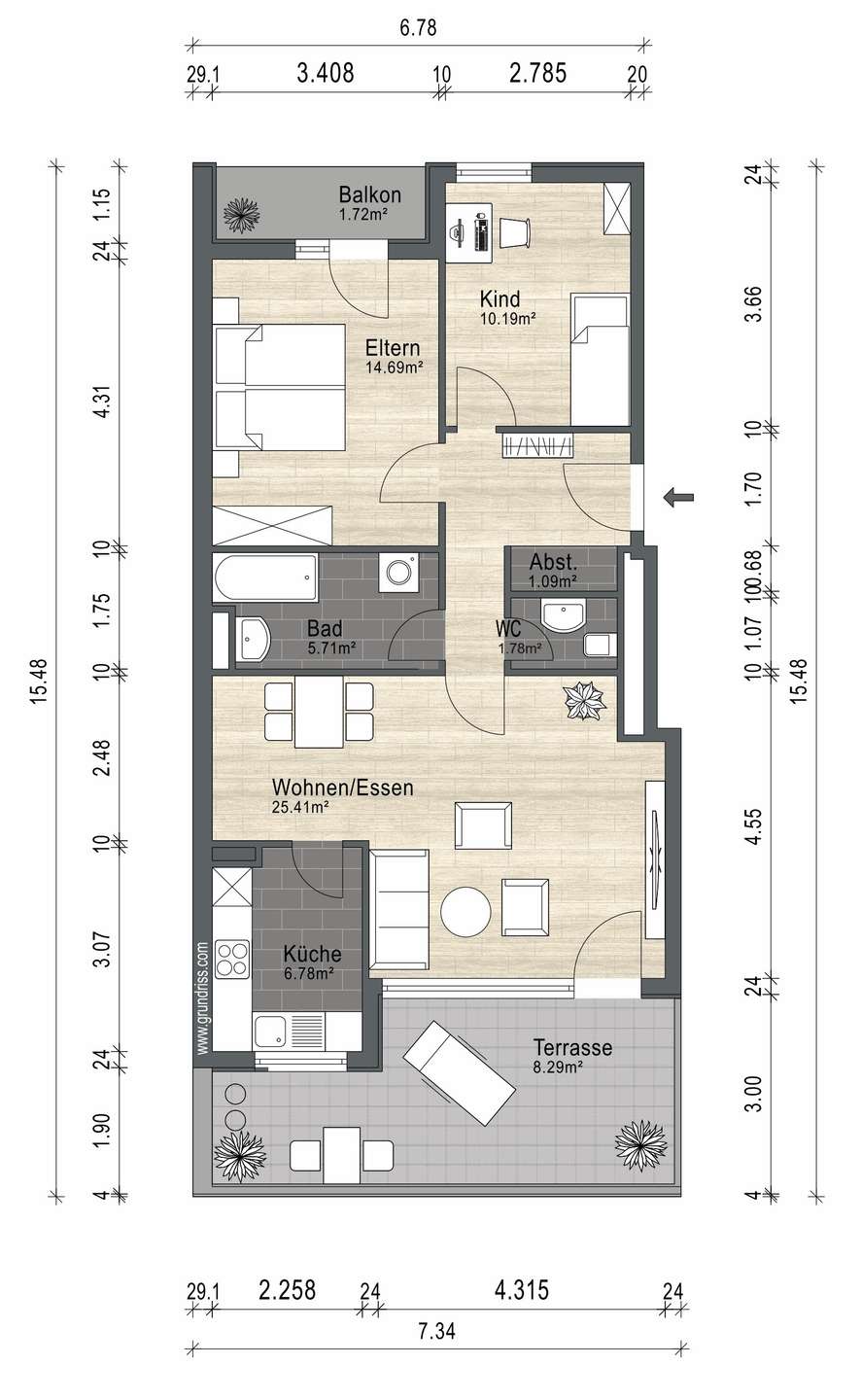 Sowohl das Schlafzimmer als auch das Kinderzimmer sind zweckmäßig geschnitten und bieten ausreichend Platz, um Bett und Kleiderschrank etc. zu stellen. An das Schlafzimmer schließt sich noch ein weiterer etwas kleinerer Balkon an. Das Badezimmer ist mit einer Badewanne und Waschmaschinenanschluss ausgestattet. Das WC ist separat gegenüber des Badezimmers.