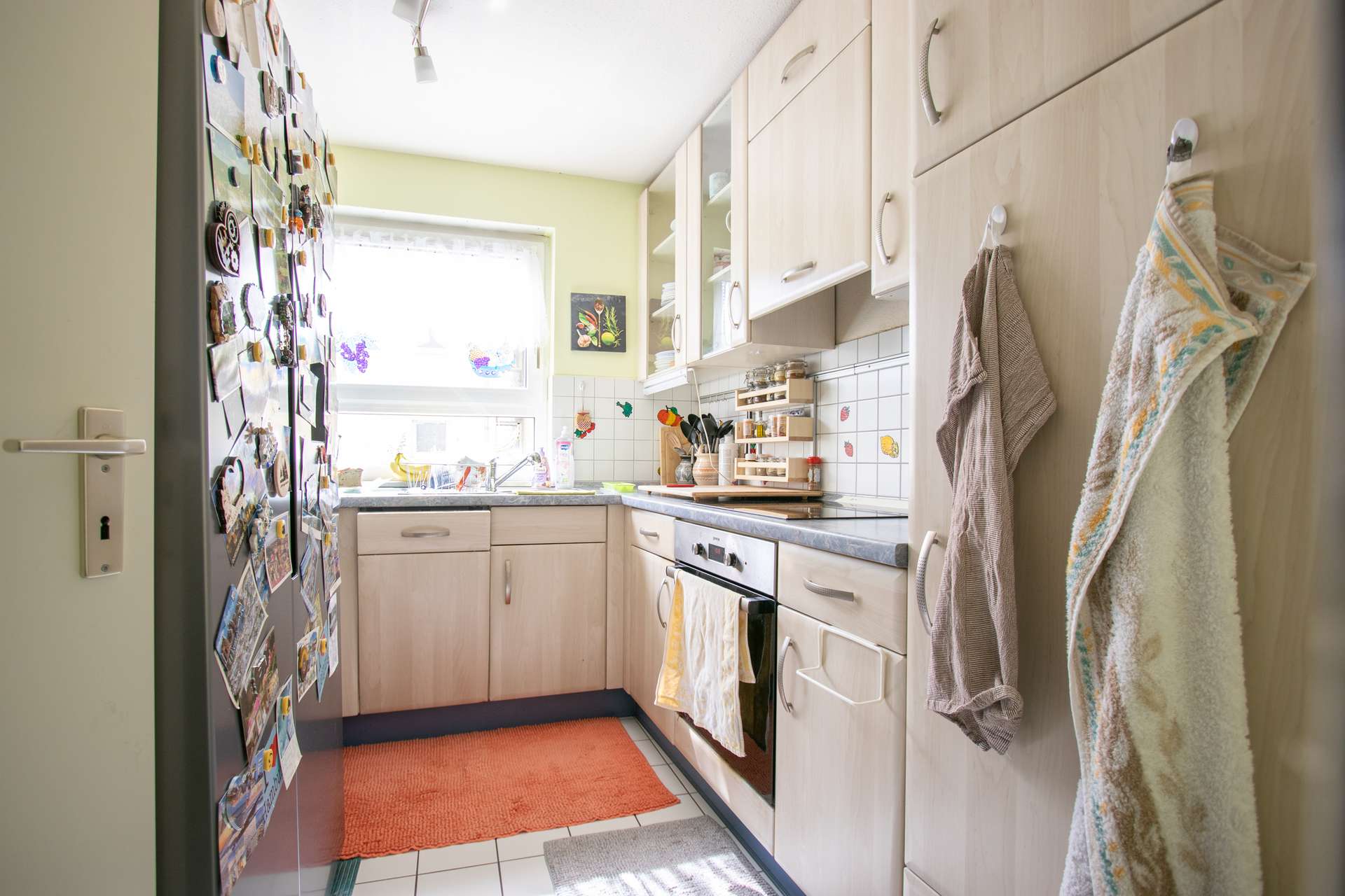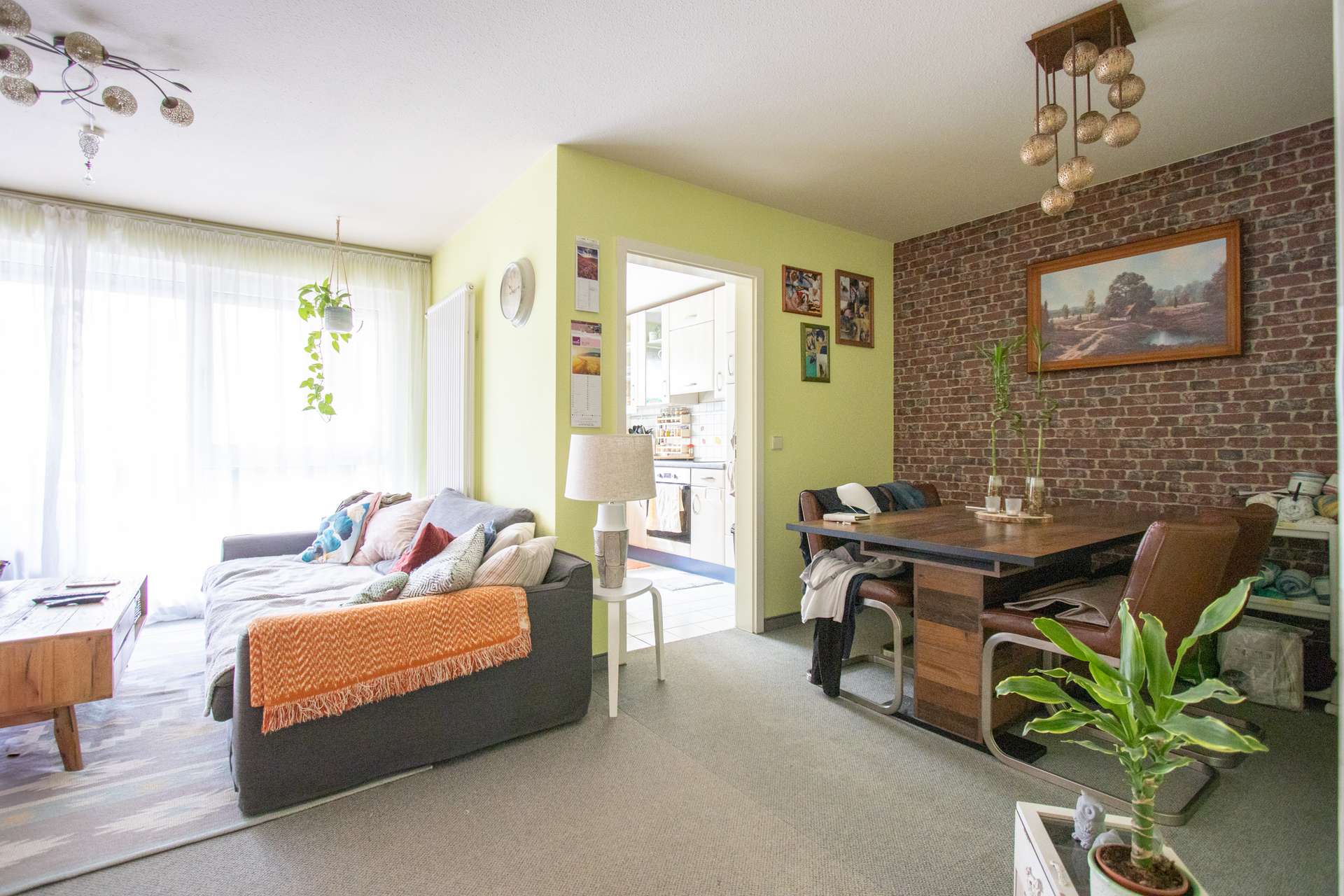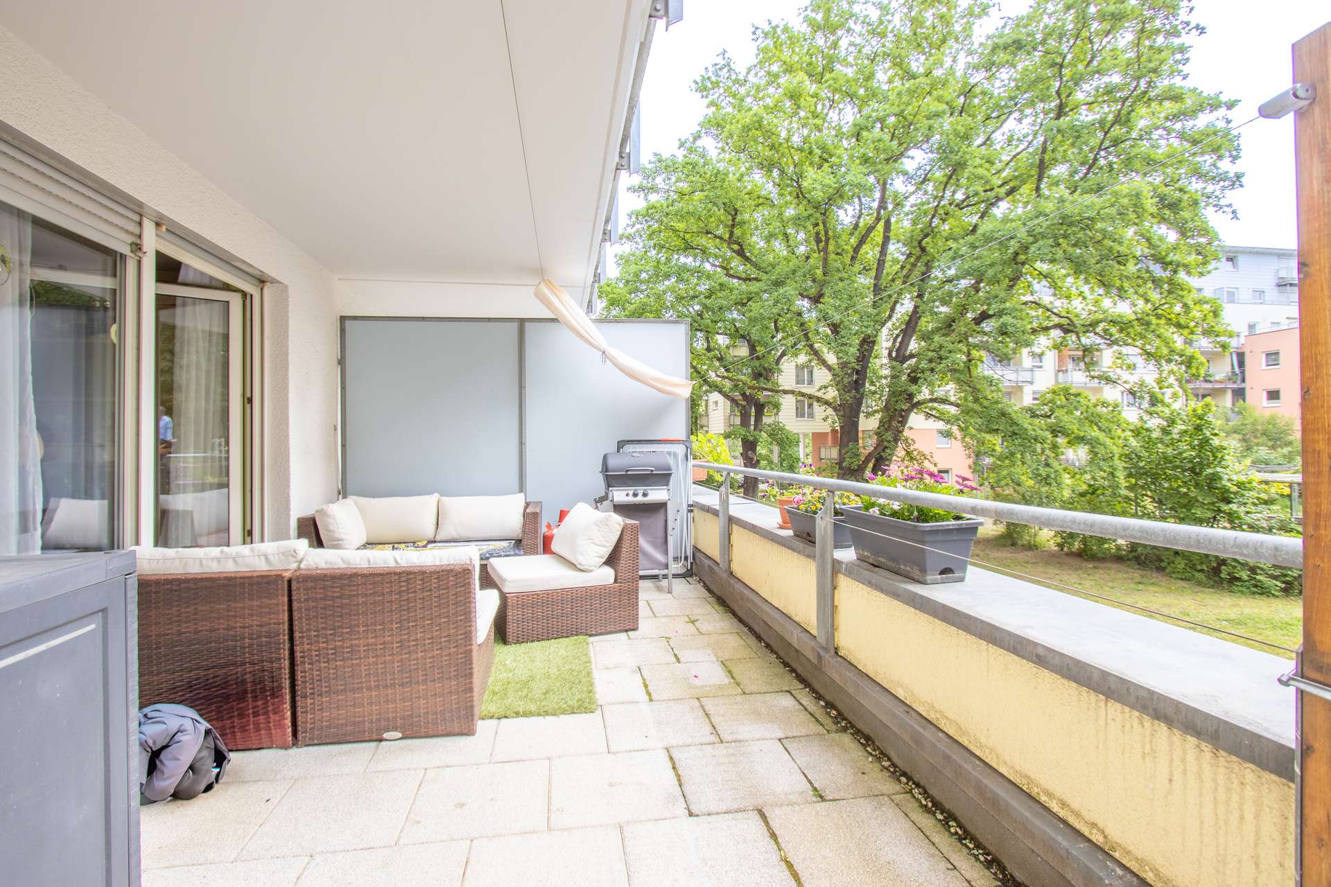 Das geräumige Wohnzimmer überzeugt mit viel Tageslicht durch die große Fensterfront zum Balkon sowie einen schönen Schnitt, der das Wohnzimmer untergliedert in einen Essbereich und einen gemütlichen Wohnbereich. Die Küche ist über das Wohnzimmer erreichbar und mit einer mietereigenen Einbauküche ausgestattet. Ein Highlight der Wohnung ist definitiv die große Terrasse, die sich an das Wohnzimmer anschließt. Hier ist viel Platz für einen Sitzbereich, Grill und Pflanzen. Von der Terrasse hat man einen schönen Blick in den ruhigen und grünen Innenhof des Gebäude-Ensembles.