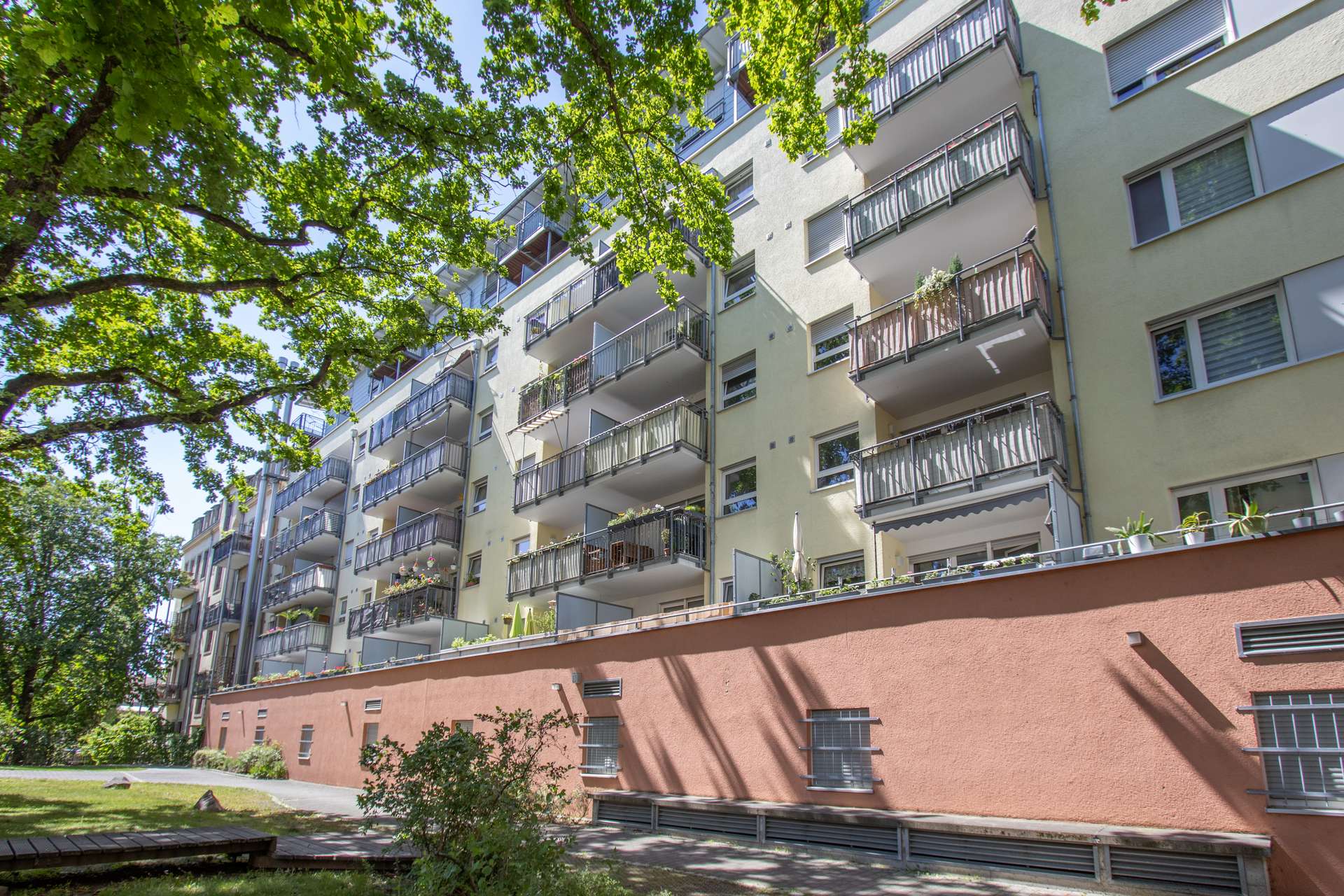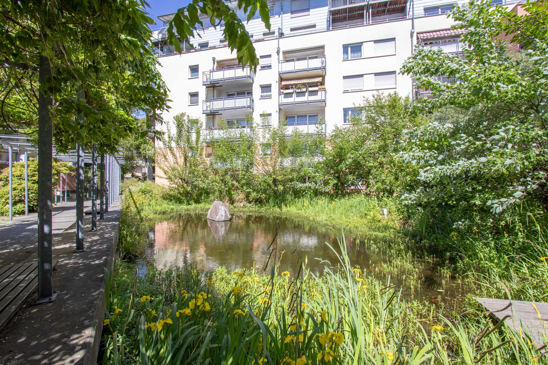 Es ist Teil eines Ensembles aus 4 Häusern, die um einen sehr schön angelegten und durchgrünten Innenhof angeordnet sind. Sogar ein kleiner Teich ist Teil dieser Anlage.