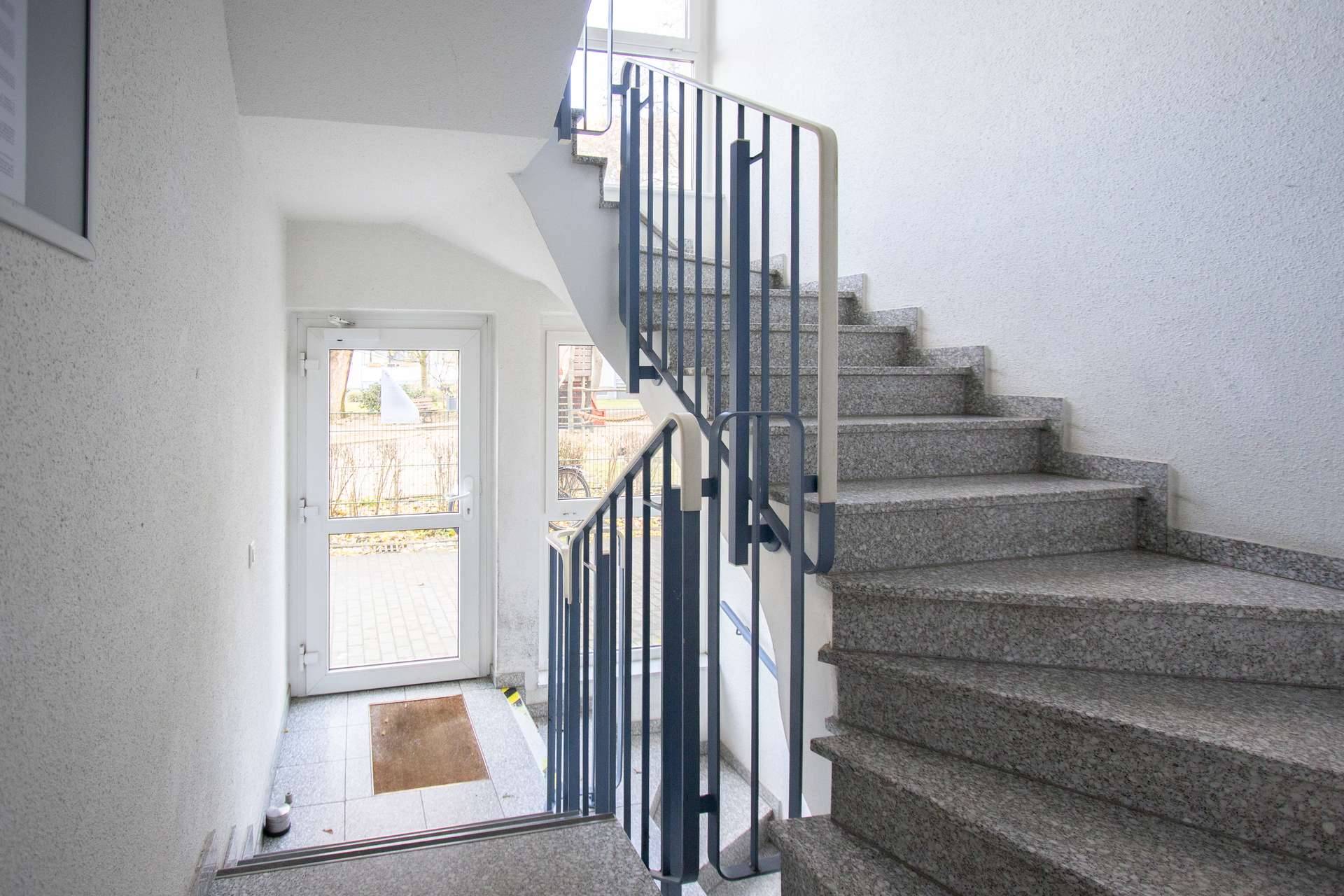 Das raumhoch geflieste Badezimmer verfügt über eine Dusche. Die Waschmaschine findet ihren Platz im Waschraum, der sich direkt gegenüber von der Wohnung befindet.