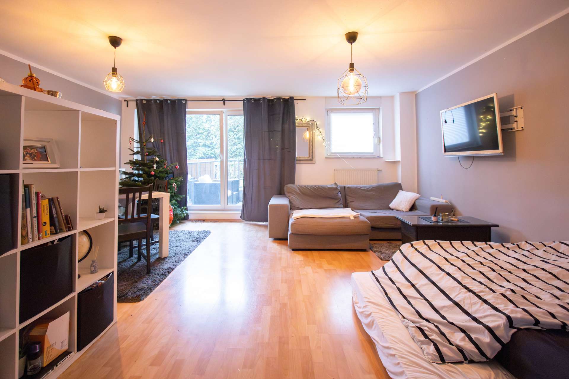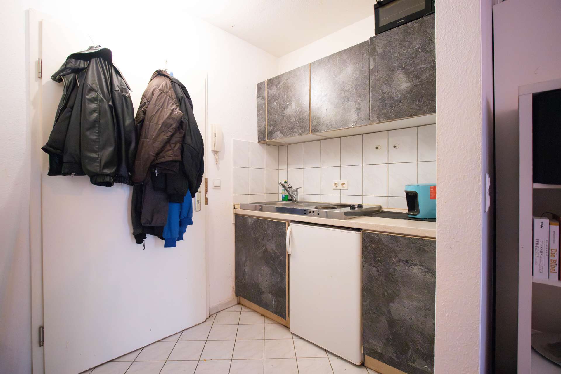 Der Flur verfügt über eine praktische Nische für die Garderobe oder ein Schuhregal. Im Flur ist zudem auch die Küchenzeile integriert. Das Wohn- und Schlafzimmer überzeugt mit einer angenehmen Größe. Hier lässt sich aufgrund der großzügigen Fläche problemlos sowohl ein Sitzbereich als auch ein Essbereich einrichten. Am Wohnzimmer befindet sich zudem eine sonnige Terrasse mit Südausrichtung, die zum Verweilen an der frischen Luft einlädt.