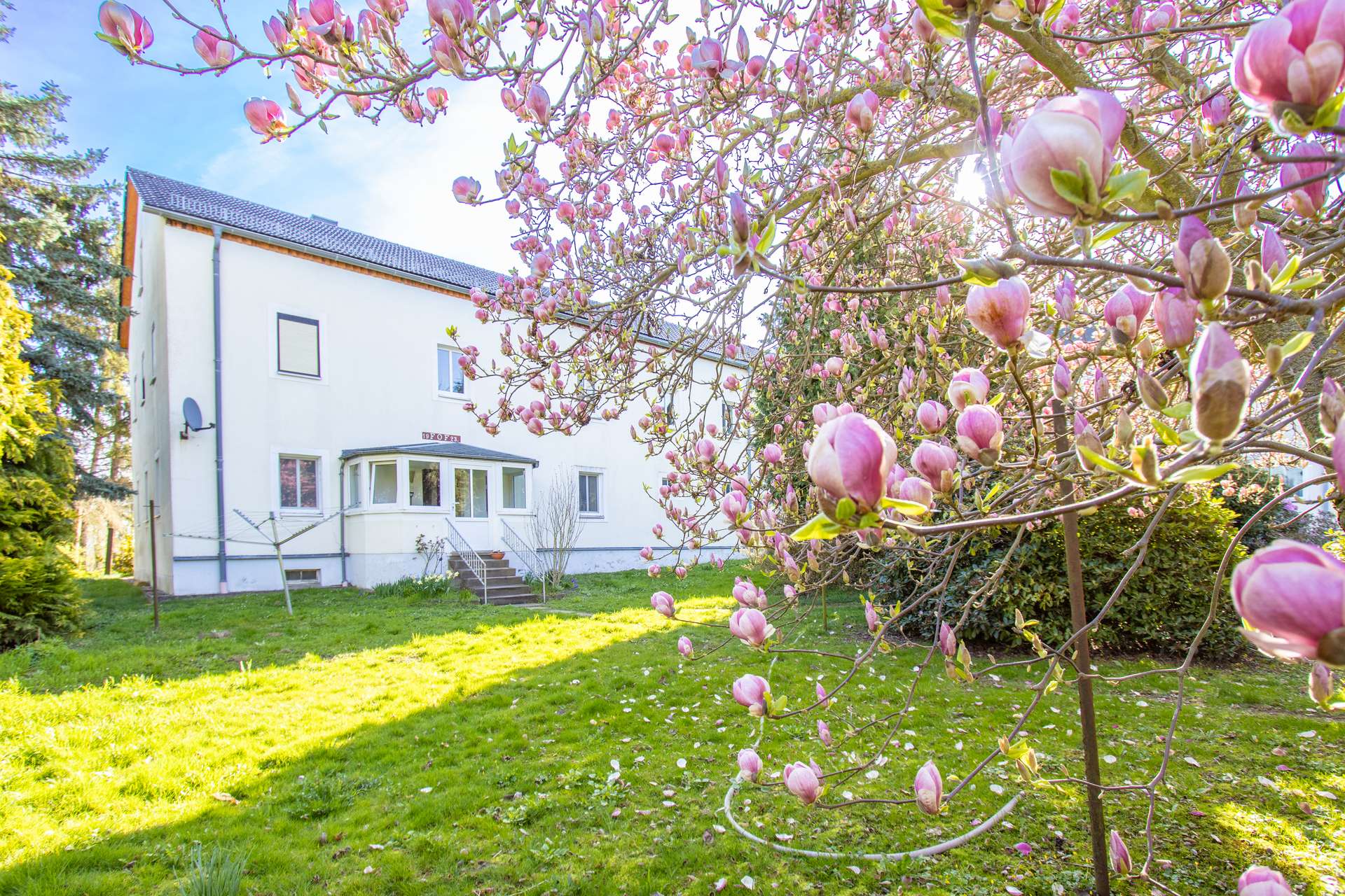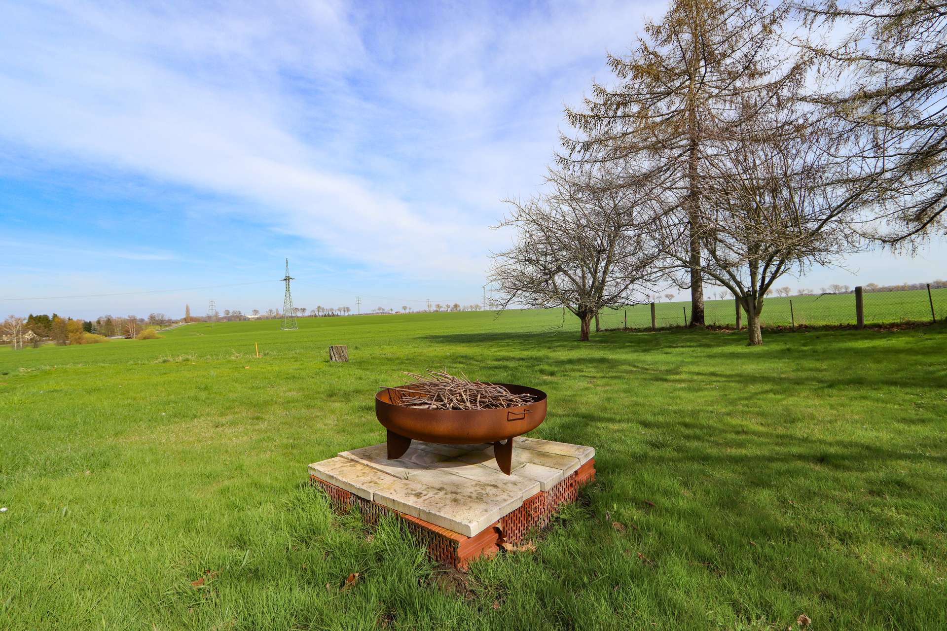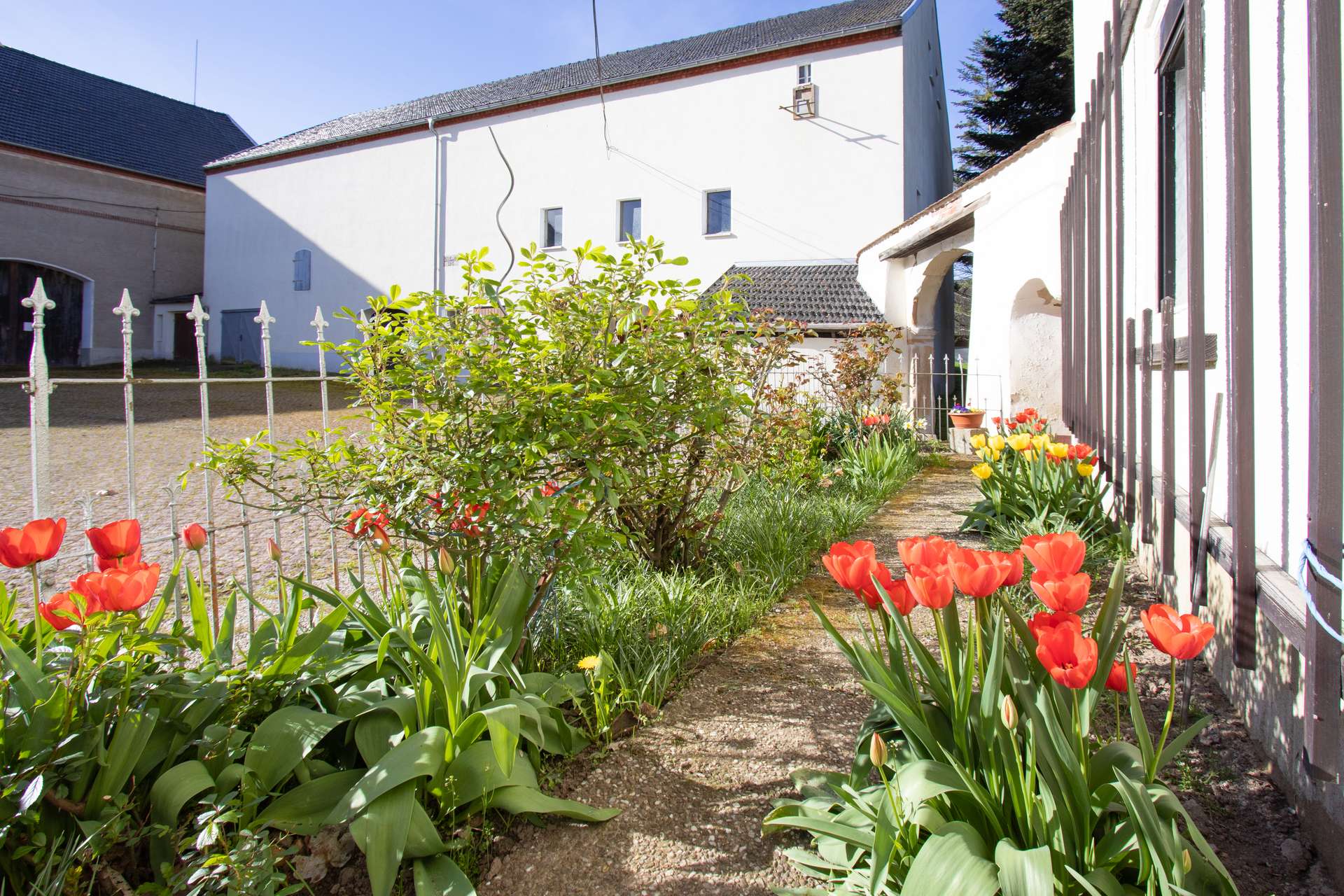 Der Grundstücksbereich hinter der westlichen Scheune wird als Pferdekoppel genutzt. Nach Süden und Osten kann der Blick frei über die angrenzenden Felder schweifen. Der Bereich vor dem Wohnhaus wurde als Garten angelegt mit verschiedenen Sträuchern und Beeten. Ein wunderschöner Blickfang insbesondere im Frühjahr ist eine Magnolie mit ihren großen rosafarbenen Blüten.