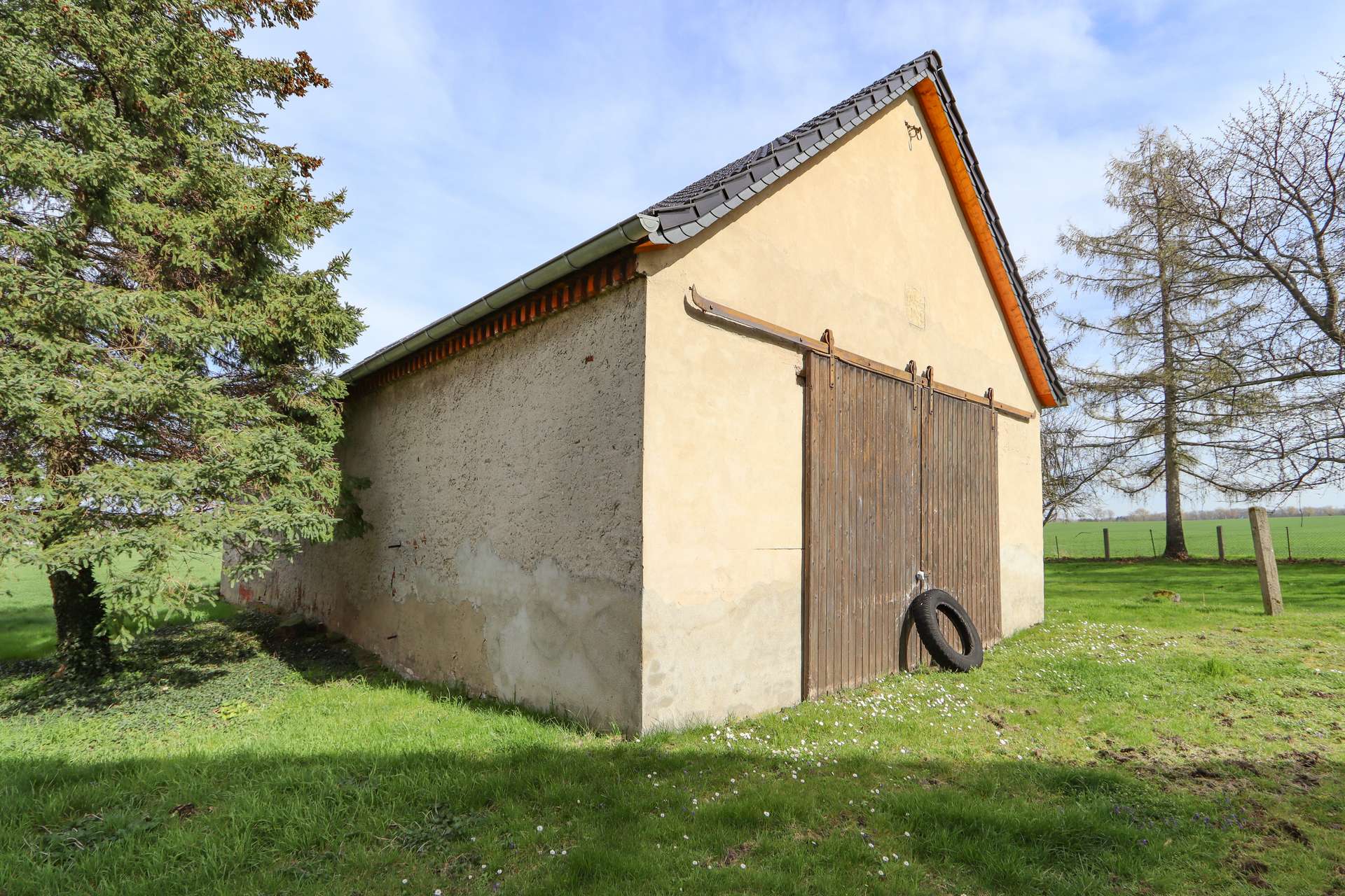 Die östliche Scheune - der ehemalige Pferdestall - befindet sich noch in einem weitgehend unsanierten Zustand. Die Dächer der Scheunen sind in einem guten Zustand. Der Maschinenschuppen hinter dem Pferdestall hat - wie das Wohnhaus - eine neue Dachdeckung nach dem Jahr 2000 erhalten und bietet mit ca. 390 m² Nutzfläche eine weitere Unterstellmöglichkeit für Fahrzeuge oder ähnliches.