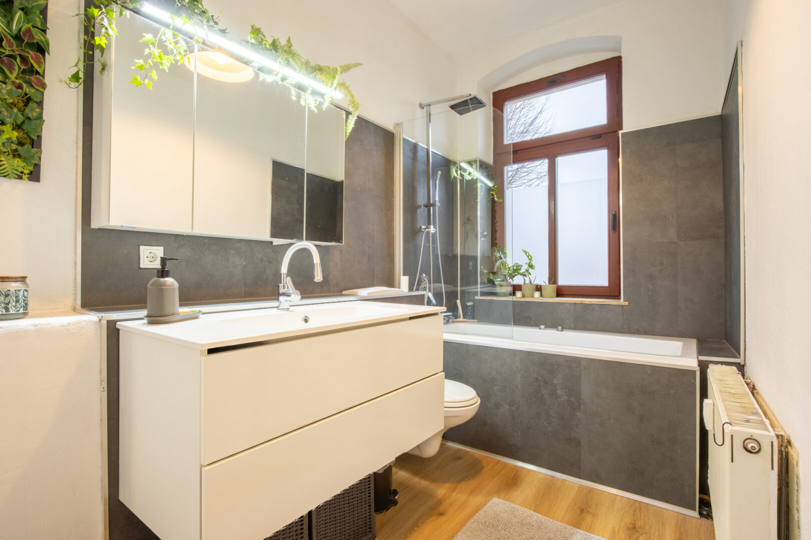 An den Flur schließt sich ein kleiner Raum an, der sich ideal als Arbeits- oder Gästezimmer eignet. Direkt daneben befindet sich das Tageslichtbad: Es ist mit einem eleganten Waschtisch, einem großen Spiegelschrank mit LED-Beleuchtung sowie einer Whirlpool-Badewanne ausgestattet – perfekt zum Entspannen nach einem langen Tag.