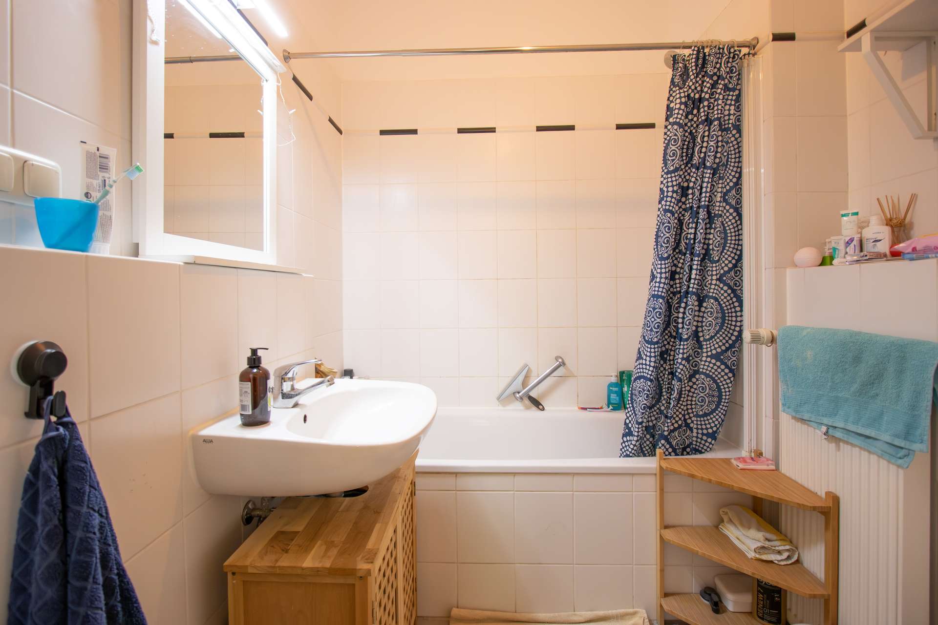 Das gepflegte und zeitlos geflieste Badezimmer ist mit einer Badewanne ausgestattet und zweckmäßig geschnitten.
