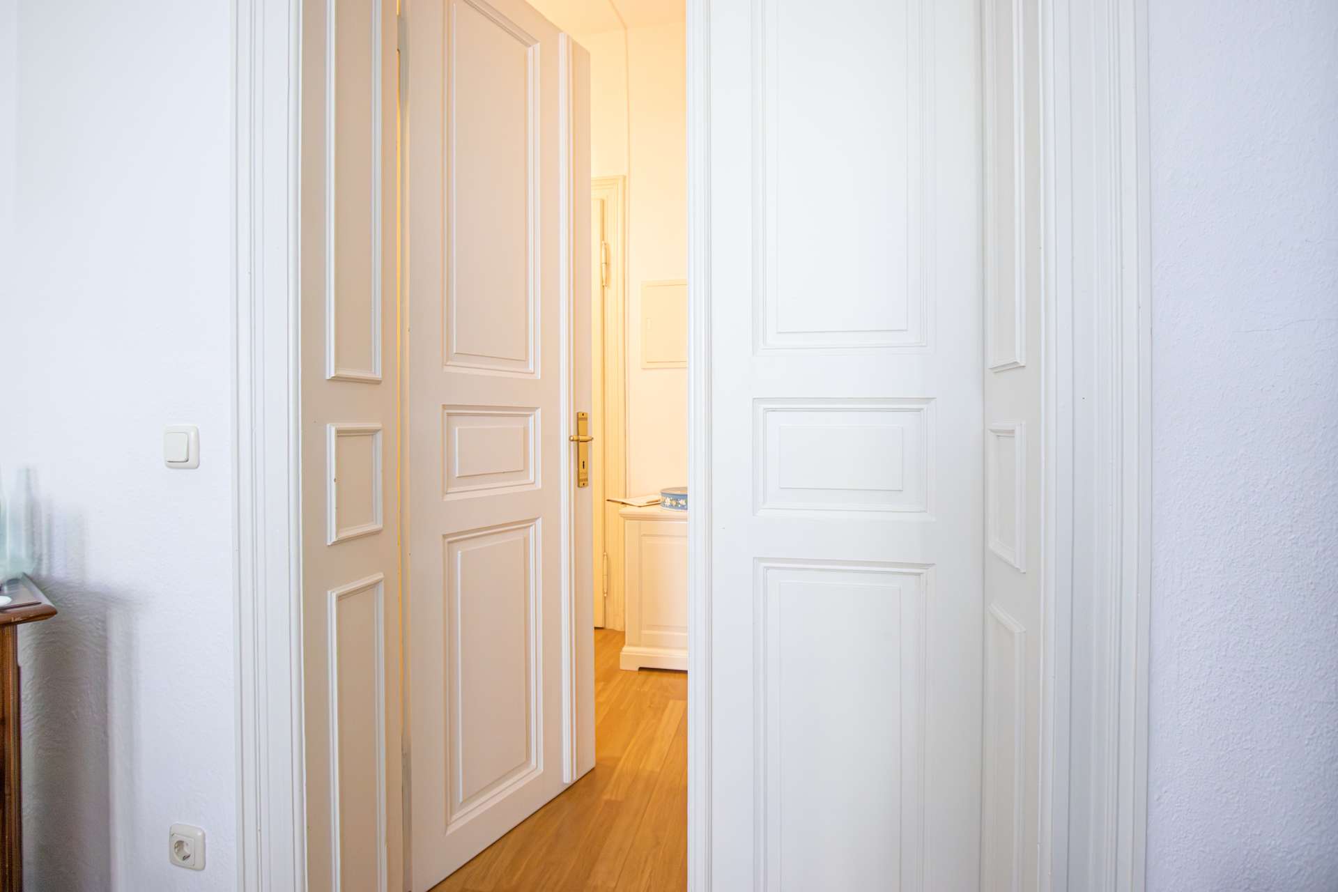 Auf ca. 60 m² Wohnfläche erwarten Sie helle, gut geschnittene Räume mit hochwertigem Eichenparkett, hohen Decken, Kassettentüren und liebevoll restauriertem Stuck, der den klassischen Altbaucharakter unterstreicht. Der nach Westen ausgerichtete Balkon mit Abendsonne bietet einen herrlichen Blick ins weitläufige, grün gestaltete Grundstück – ein idealer Rückzugsort mitten in der Stadt.