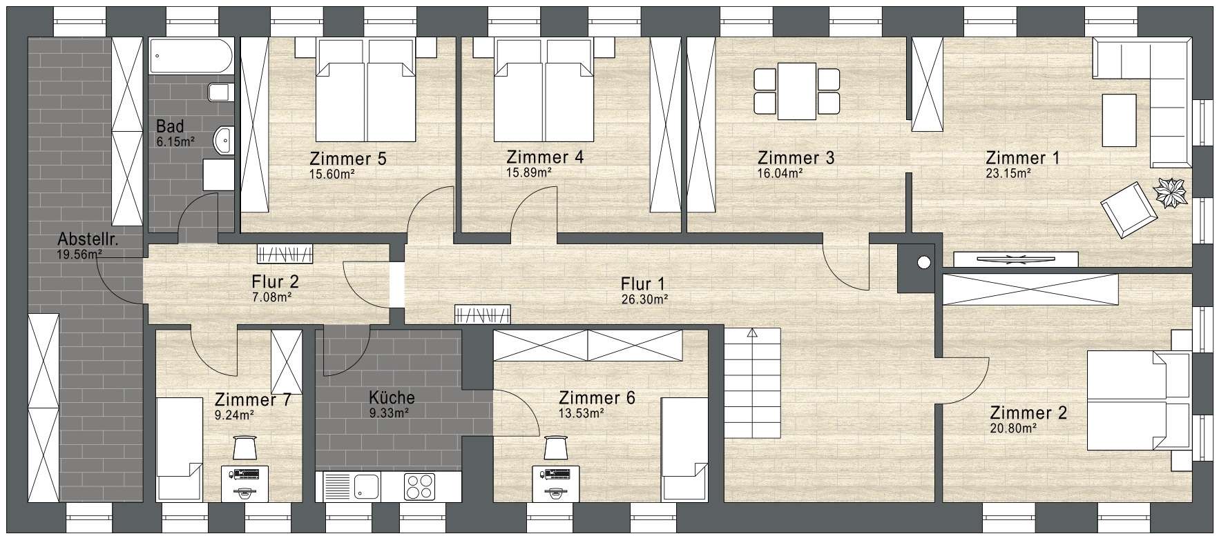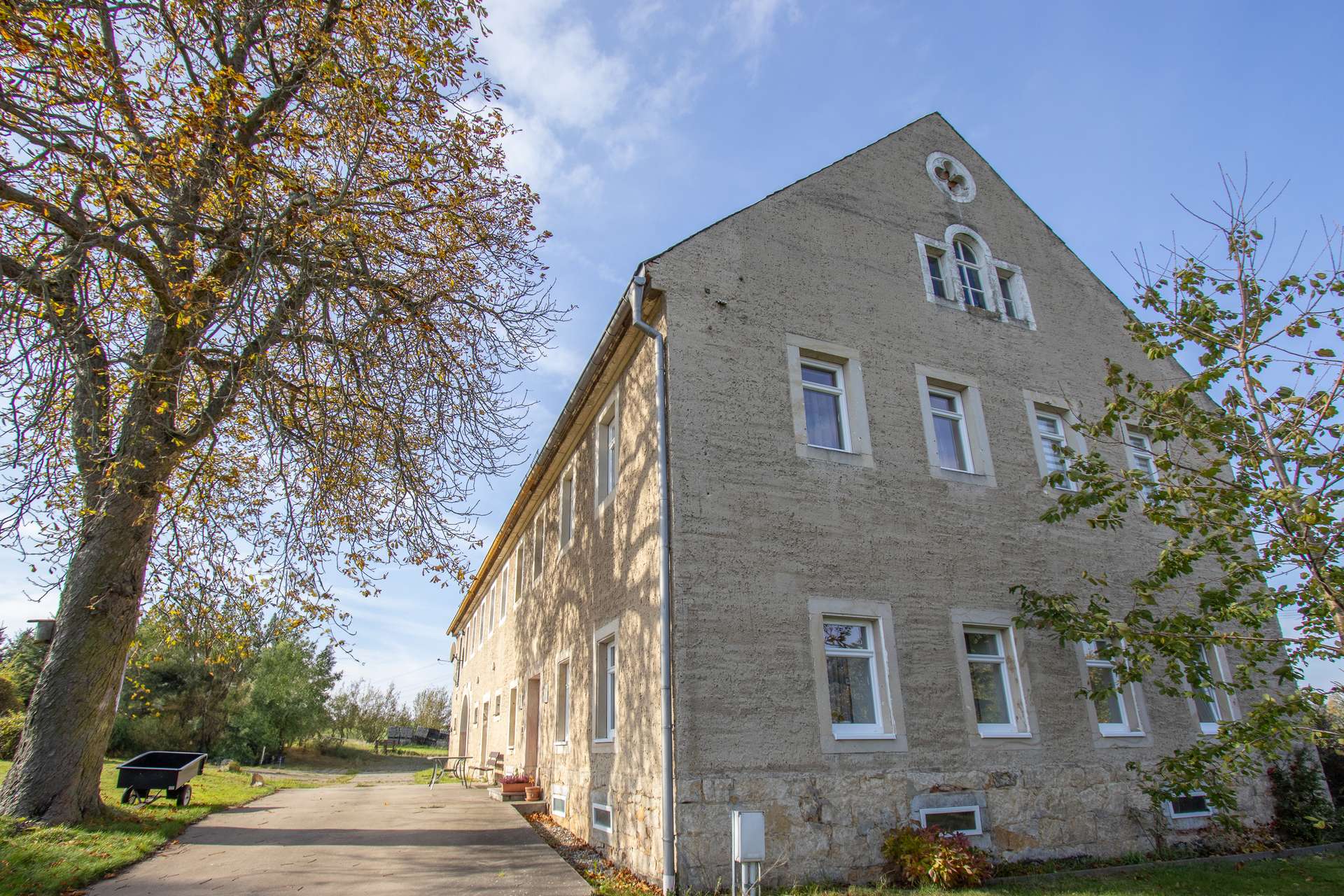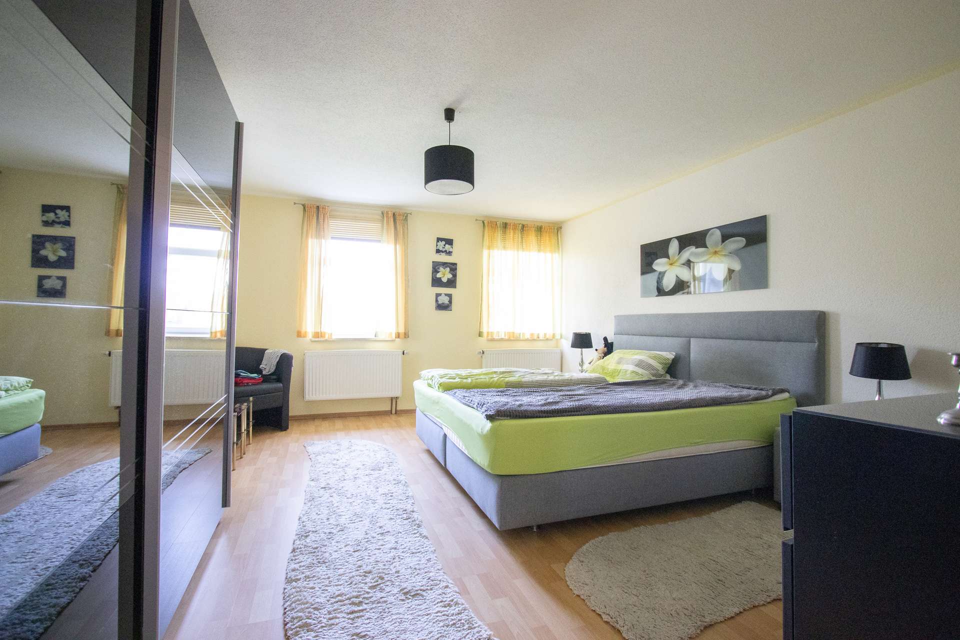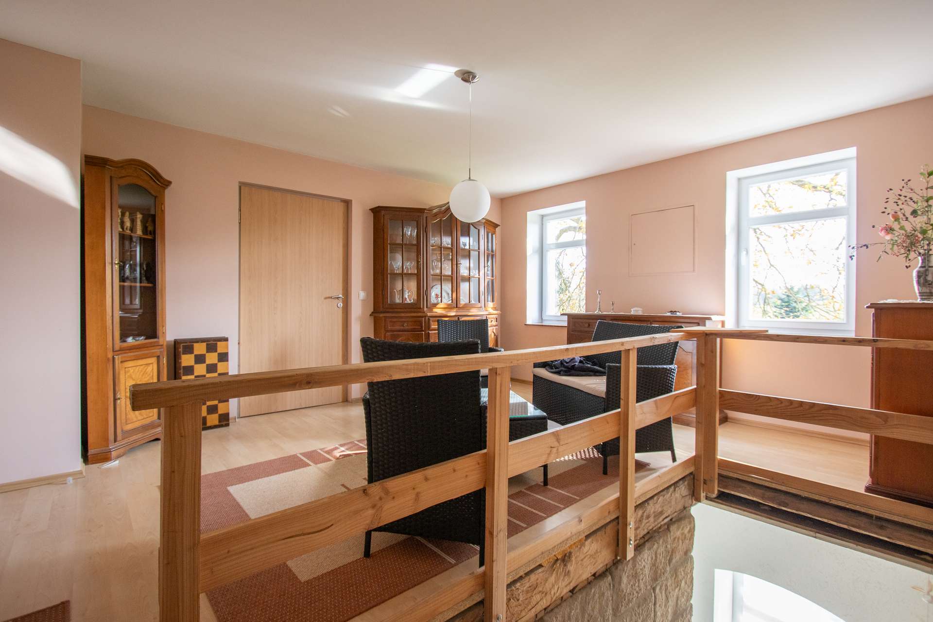 Das Obergeschoss beherbergt mehrere schön geschnittene und helle Zimmer, die z.B. als Schlaf-, Kinder- oder Arbeitszimmer genutzt werden. Zwei Zimmer im Obergeschoss befinden sich bisher noch im unsanierten Originalzustand und warten darauf, nach Ihren Vorstellungen gestaltet zu werden. Des Weiteren befindet sich im Obergeschoss eine Einliegerwohnung mit eigenem Badezimmer und Küche. Die Räumlichkeiten der Einliegerwohnung wurden in den 90er Jahren saniert. Über die gesamte Breite der Giebelwand befindet sich ein großer Abstellraum. Von hier gelangt man in den Dachboden, der ebenfalls viel Abstellfläche bietet. Weitere Lagermöglichkeiten stehen im imposanten Gewölbekeller des teilunterkellerten Bereiches des Wohnhauses zur Verfügung.