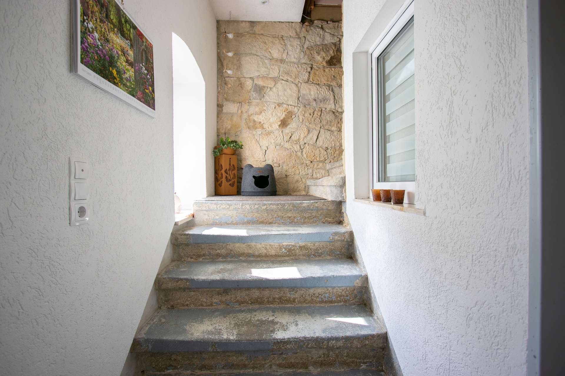 Über einen Windfang gelangt man in den gefliesten Eingangsbereich des Erdgeschosses. Hier ist Platz für Ihre Garderobe und Schuhe. Rechter Hand befindet sich ein Zimmer, welches derzeit als Fernsehzimmer genutzt wird. Geradeaus gelangt man in die Küche, die zugleich Platz für einen Esstisch bietet. An die Küche grenzt ein weiteres geräumiges Zimmer an, welches aktuell als Schlafzimmer genutzt wird. Von der Küche gelangt man zudem in ein Badezimmer mit Dusche, WC und Waschmaschinenanschluss. In einem separaten Abstellraum findet sich hier ein Hauswasserwerk, das von einem Brunnen gespeist wird und für Brauchwasser genutzt werden kann.