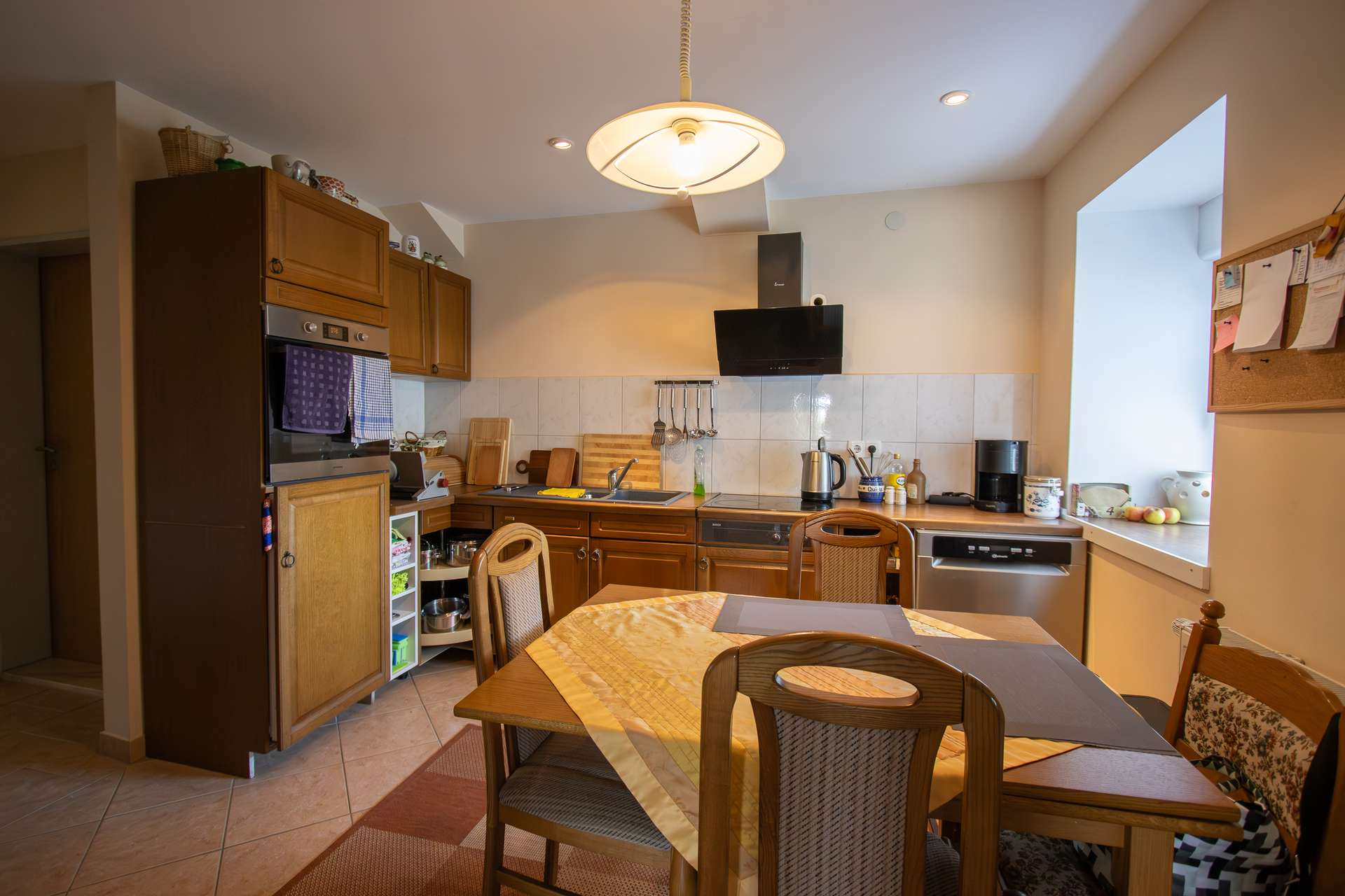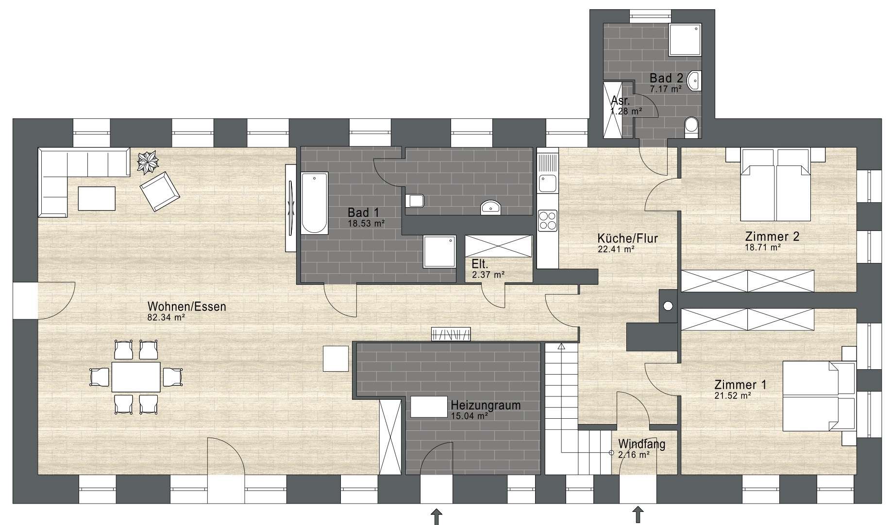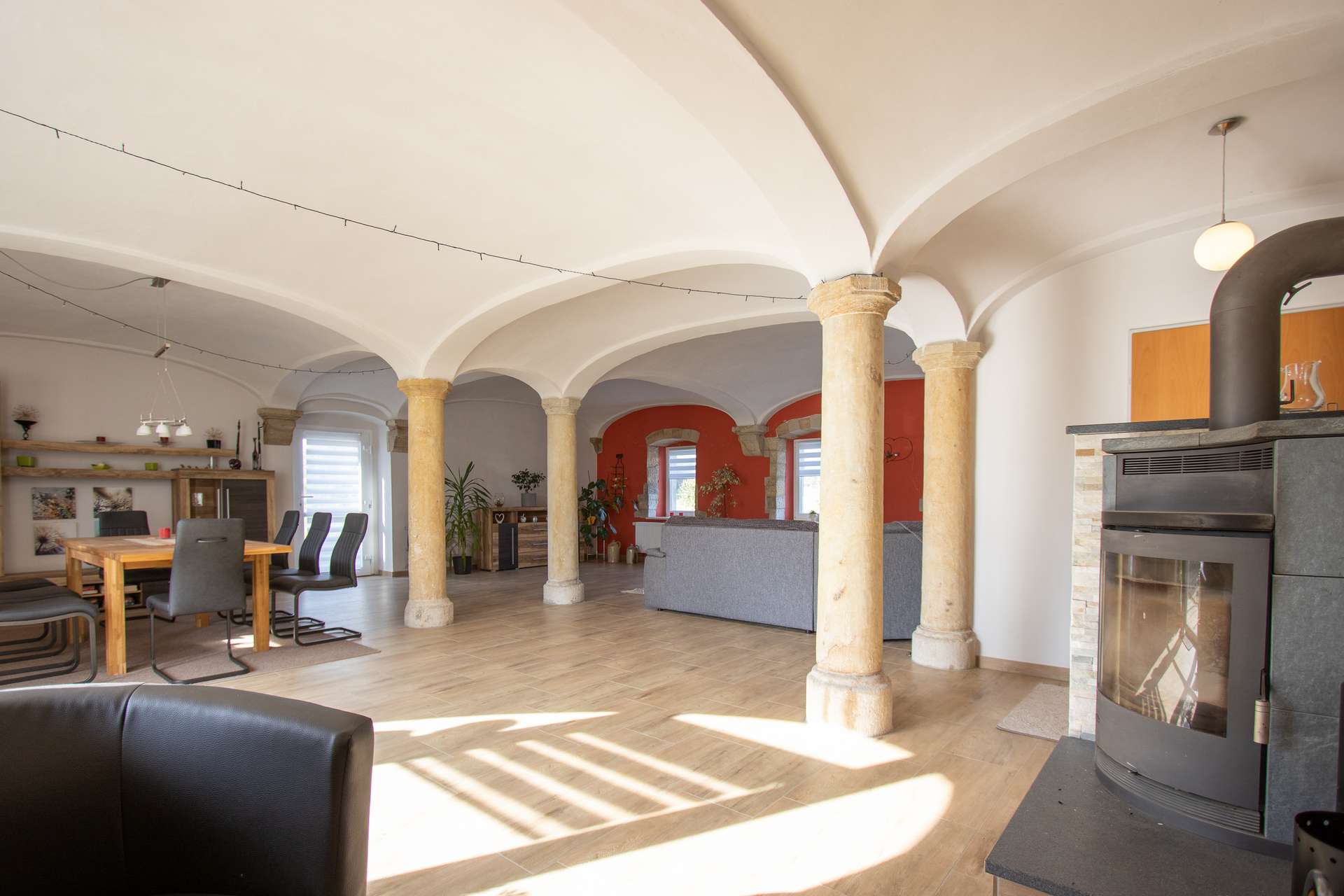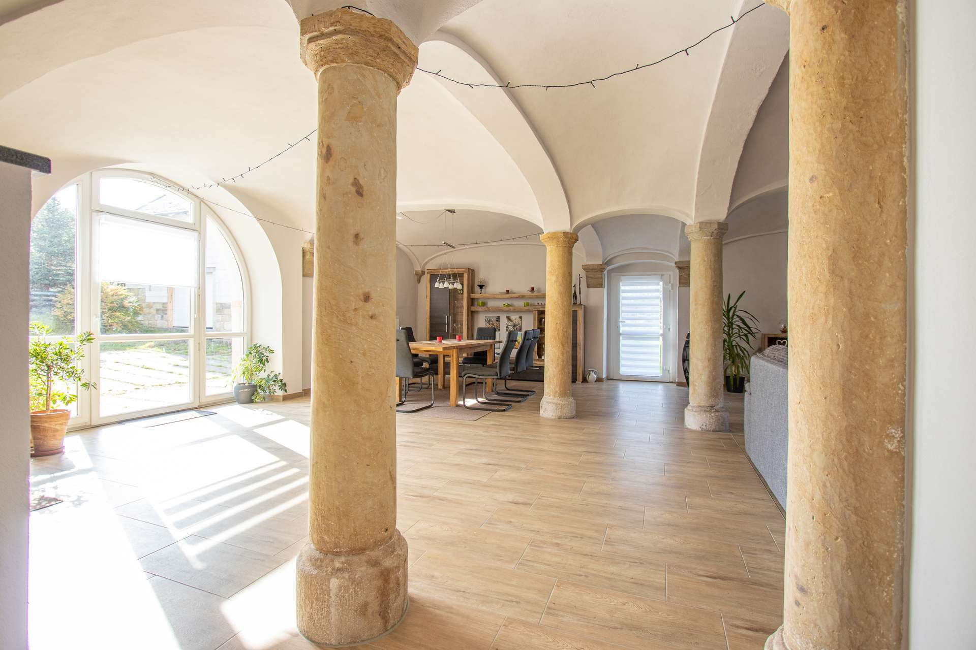 Ein absolutes Highlight im Erdgeschoss ist zweifelsfrei der ehemalige Stall, der zu einem großzügigen Wohn- und Essbereich mit mehr als 80 m² Wohnfläche umfunktioniert wurde. Die wunderschönen Sandstein-Säulen in Verbindung mit den Gewölbedecken verleihen diesem Raum eine ganz besondere Atmosphäre. Hier wurde die historische Bausubstanz mit dem Anspruch an modernes Wohnen perfekt kombiniert. Ein Kaminofen sorgt für eine gemütliche Stimmung in den Wintermonaten.