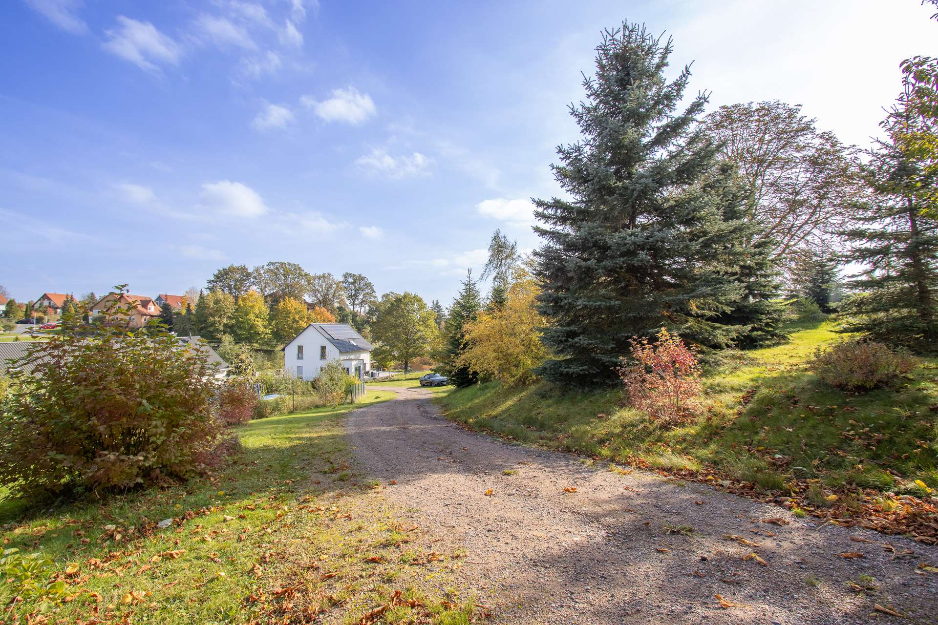 Die geschotterte Auffahrt schlängelt sich die Anhöhe hinauf und mündet vor dem Wohngebäude und der stattlichen Rosskastanie, die im Sommer ein schöner Schattenspender ist.