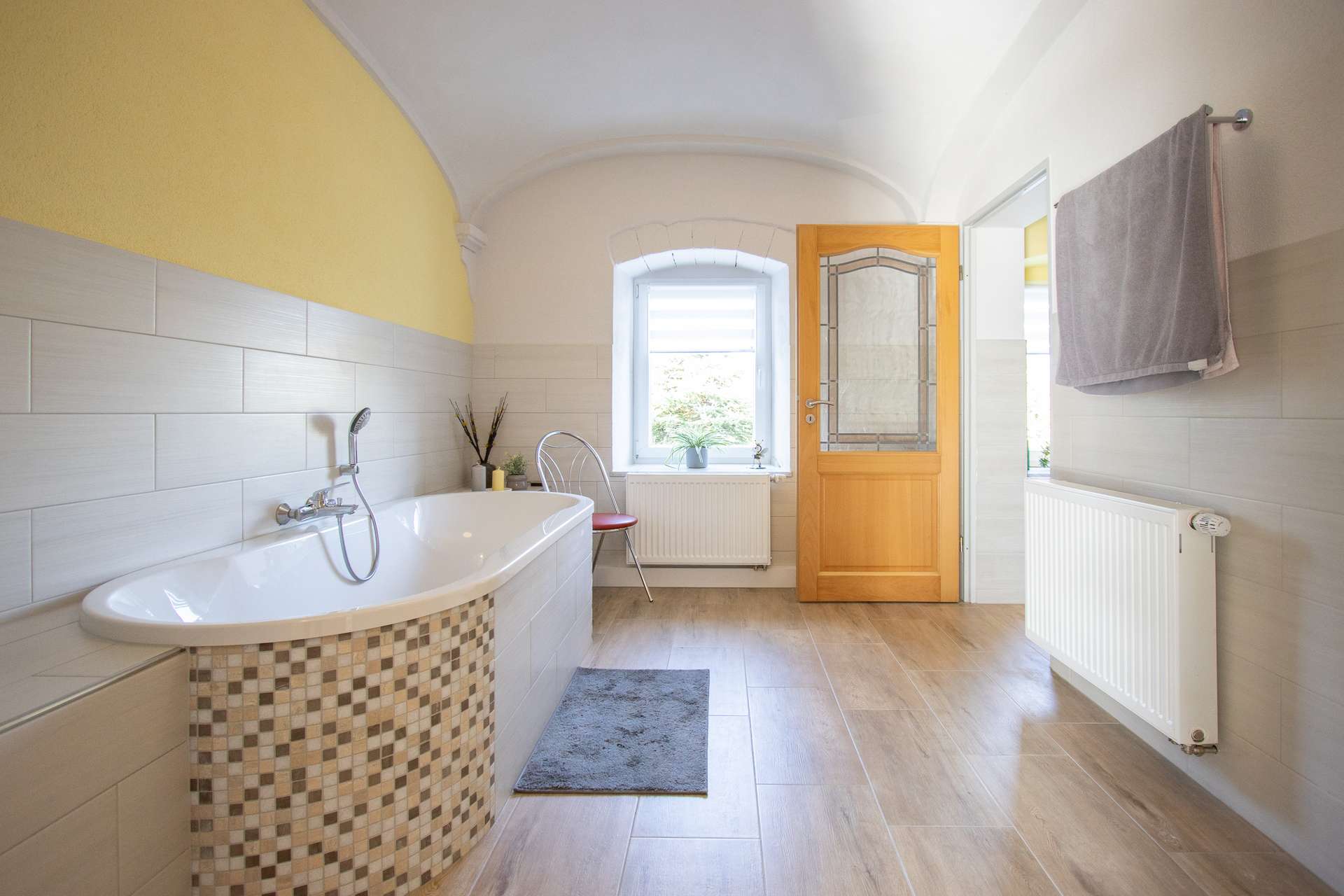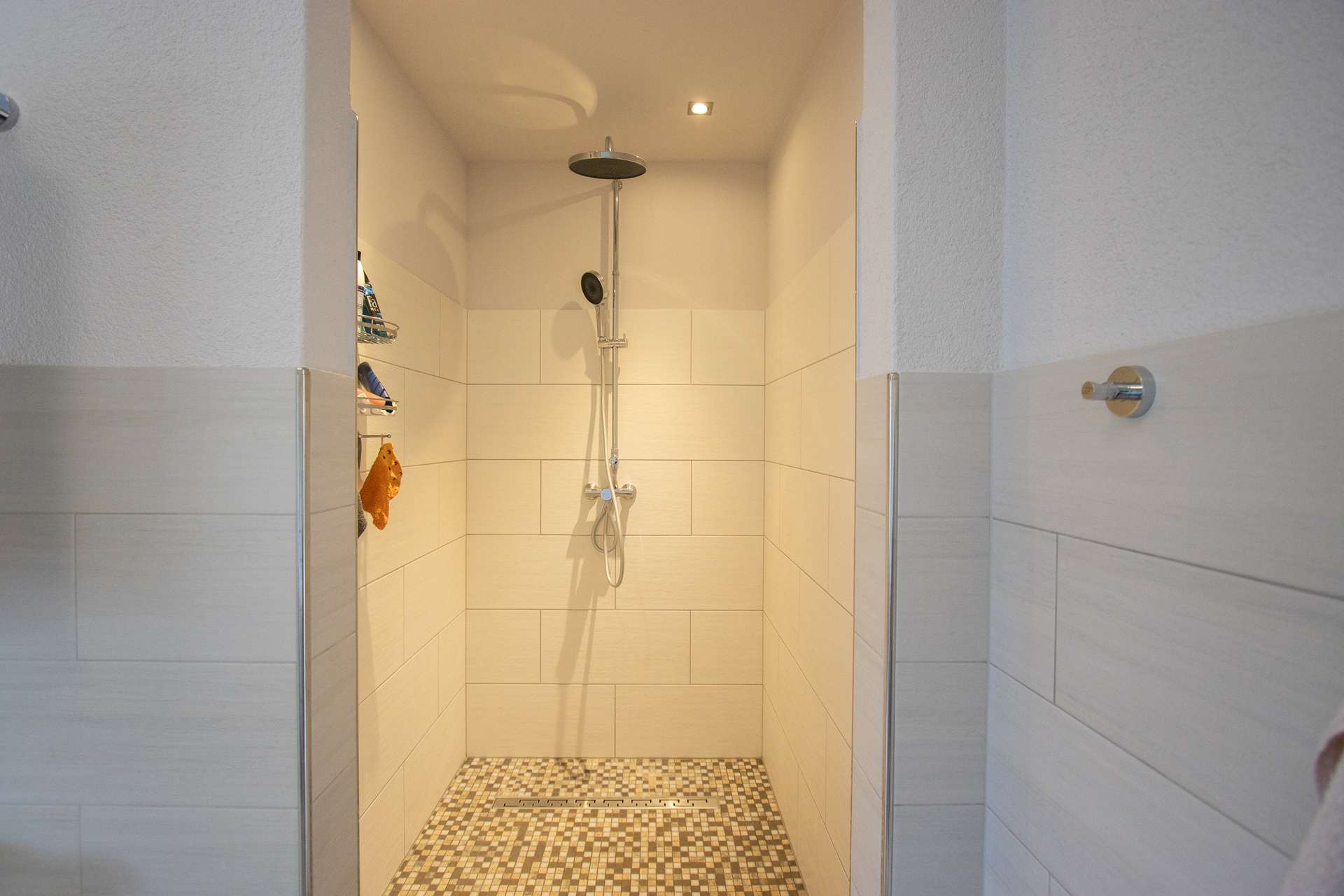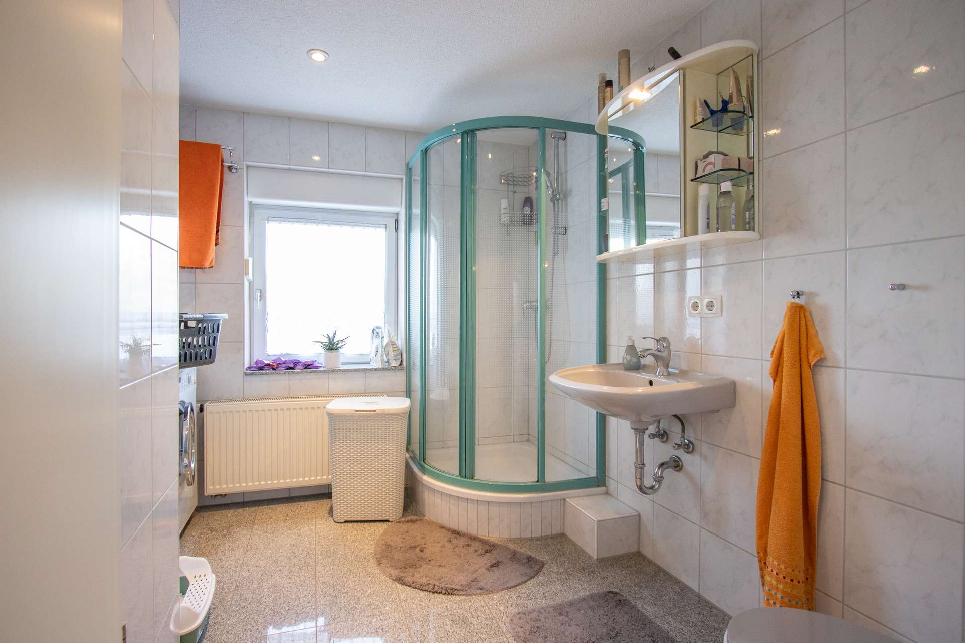 An den Wohn-/Essbereich grenzt ein weiteres sehr schönes Badezimmer mit Wohlfühlfaktor an. Es wurde erst 2023 modernisiert und ist neben einer Badewanne auch mit einer großen bodengleichen Dusche ausgestattet.